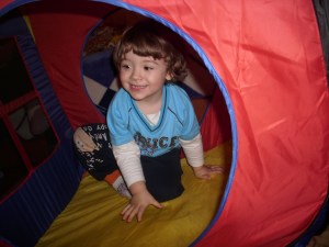 Intr-o zi, ne-am dus la un minimarket. Pe langa rafturile din magazin, stateau niste domnisoare dragute(vanzatoare acolo) si tot incercau sa-i atraga atentia…el, mai timid….se tot agata de mine , dar din cand in cand le arunca si zambete:)…IN cele din urma, cum ele ii tot faceau „cucu-bau” si incercau sa se joace cu ele, il aud:” Da, ce va uitati asa la mine carcotaselor,  ori nu ati mai vazut asa cocos frumos in viata voastra?!!!„:)))…bineinteles, excludeti de aici orice litera „r” sau „l”….eu m-am amuzat teribil….micutul meu a stiut sa aplice o replica din desenul lui indragit la situatia in care se afla.