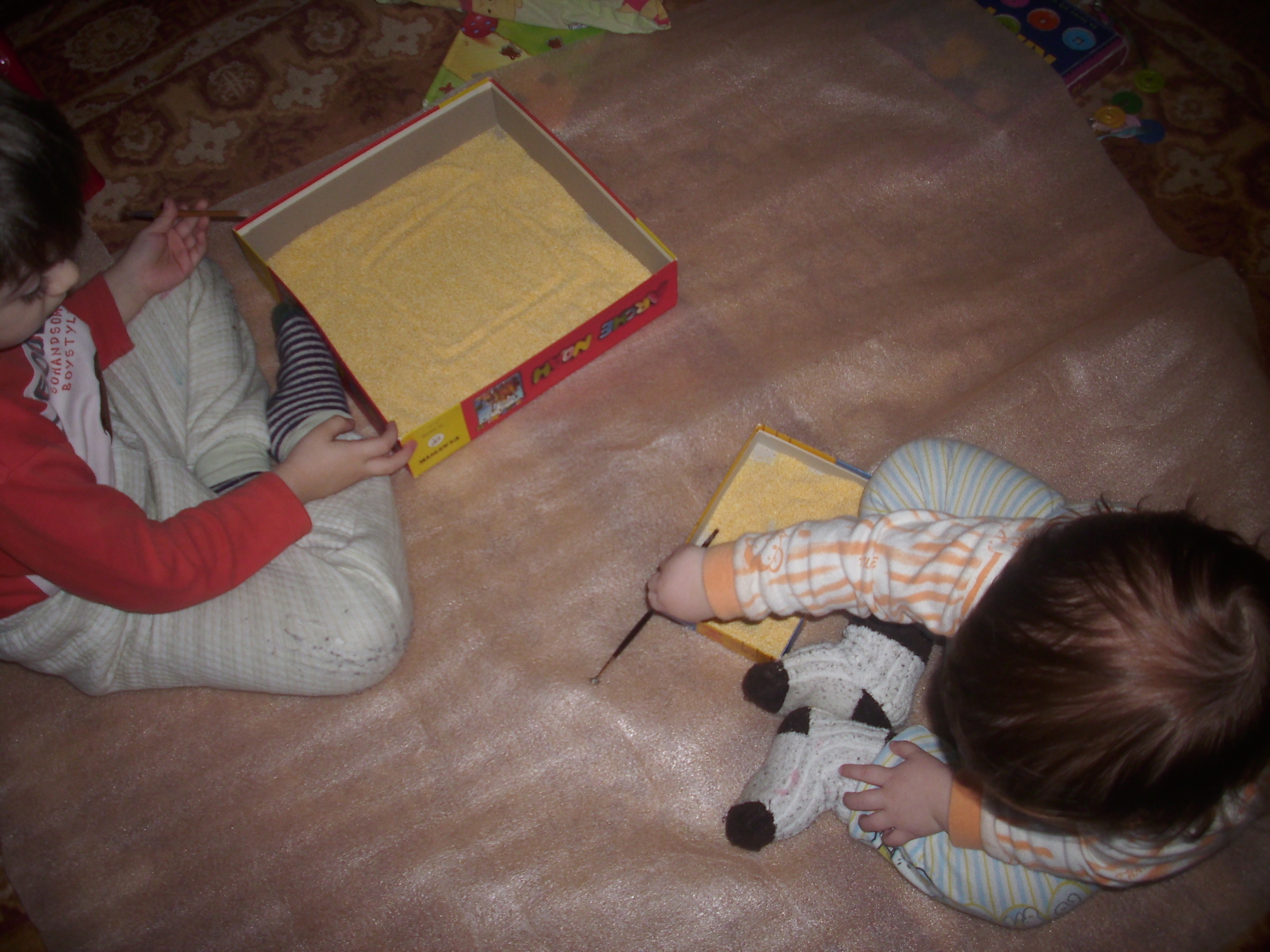 Mi-a placut mult ideea de  aici cu scrisul pe malai. Mi-au povestit si prietenele mele de pe forumul copilul ro, ca, la o gradinita speciala pentru copilasi ff mici (1-3 ani) folosesc „joaca cu malai”. Aveau o masa- ladita uriasa, plina cu malai si piticii turnau cu canitele, aveau lopatele….cred ca erau tare incantati .:)