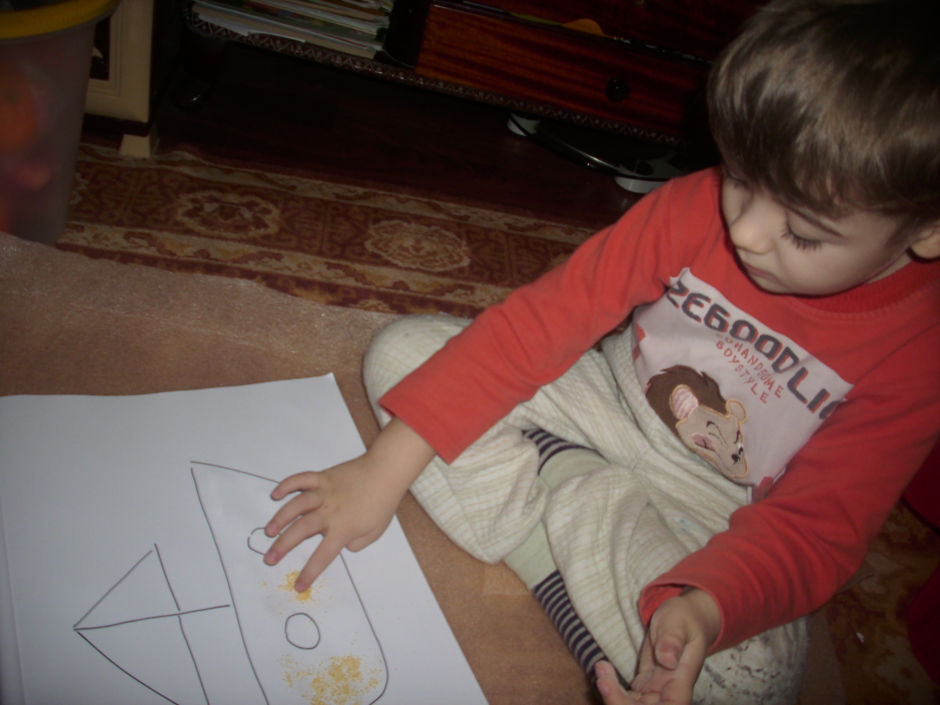 Pentru astfel de activitati folosesc o folie mare, termoizolanta,  pe care o intind pe covor (constat ca trebuie sa luam una mai mare, dar bine ca ei totusi, se joaca intr-u loc)….dupa ce terminam…nu trebuie decat sa o scutur….