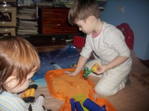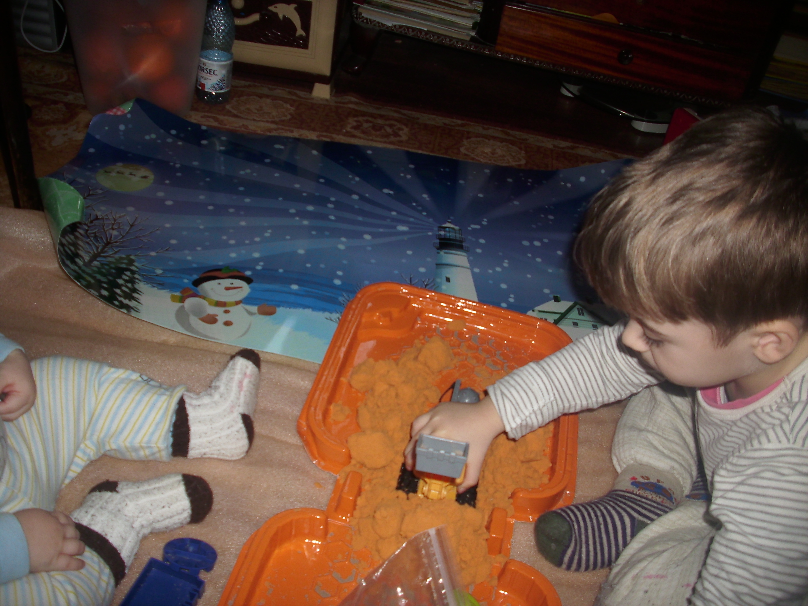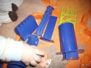 A fost o investitie cam mare, dar s-a meritat….D. este intotdeauna foarte incantat sa se joace cu Moon Sand. Recunosc, ca, de cand s-a facut Alex mai maricel ( 9 luni), nu i l-am mai dat pentru ca vroia si cel mic si deja vedeam nisipul mancat si imprastiat prin toata casa. Asa ca, am scos cutia cu Moon Sand si accesoriile acum cateva zile( si bineinteles am pus pe jos folia noastre termoizolanta:))…deja Alex intelege, e mai maricel si incearca sa imite joaca fratiorului mai mare. Nisipul este recomandat copiilor peste 3 ani, bineinteles, dar eu nu-l las nesupravegheat nici pe D. cand se joaca cu el.