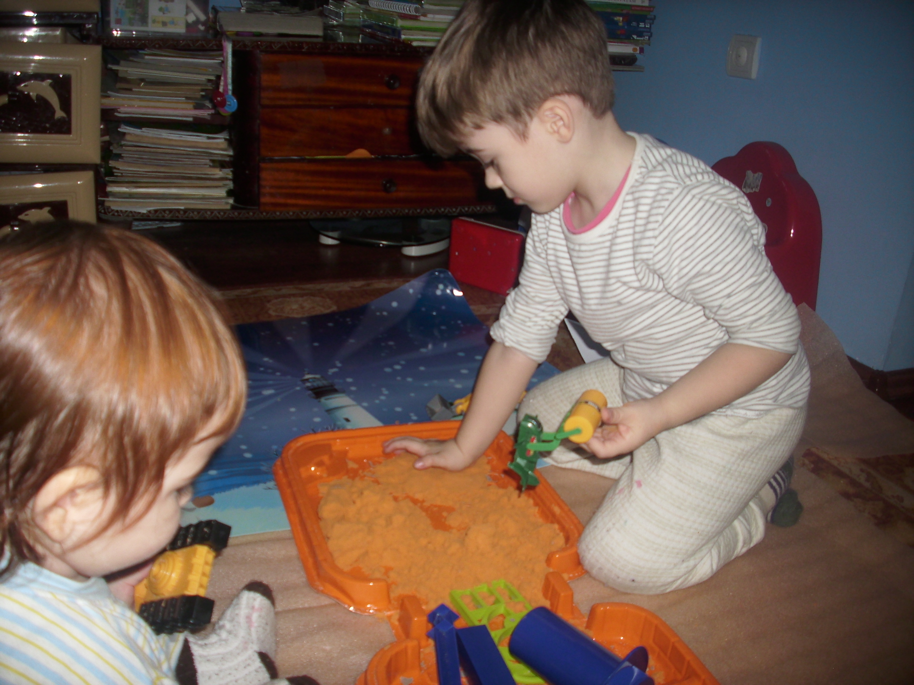 Dar si mie mi s-a parut foarte interesant acest nisip si un prilej de a-i umple timpul…..Si i-am promis lui D, ca, daca va reusi sa foloseasca toaleta/olita ca baieteii cei mari , si nu ca fetitele :)……atunci ii vom cumpara acest joc….El este genul de copilas foarte cuminte, care face foarte multe lucruri, fara sa astepte absolut nimic….tocmai de aceea , m-am gandit ca aceasta recompensa i l va motiva….era „o chestie” pe care nu o reusea,, deci ceva important ….
