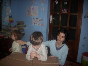 Tati ne-a adus o cutie uriasa (de foarte multe ori ne aduce cutii, pentru ca lor le place sa se ascunda in ele, lui D. sa deseneze usi , ferestre, etc) . NOi, eu si D. am facut zeci de gaurele in ea cu o surubelnita. L-am lasat si pe D. si a fost tare, tare priceput, mai ales ca se gaurea foarte usor cartonul.