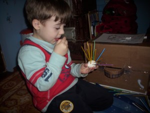 Activitatea a fost foarte captivanta pentru D., caruia ii place mult sa construiasca, sa inventeze. Si A. s-a chinuit si el, cum a putut sa infiga cateva betigase in plastilina si mergea la tati foarte mandru cu ceea ce construiam D si cu mine. 🙂