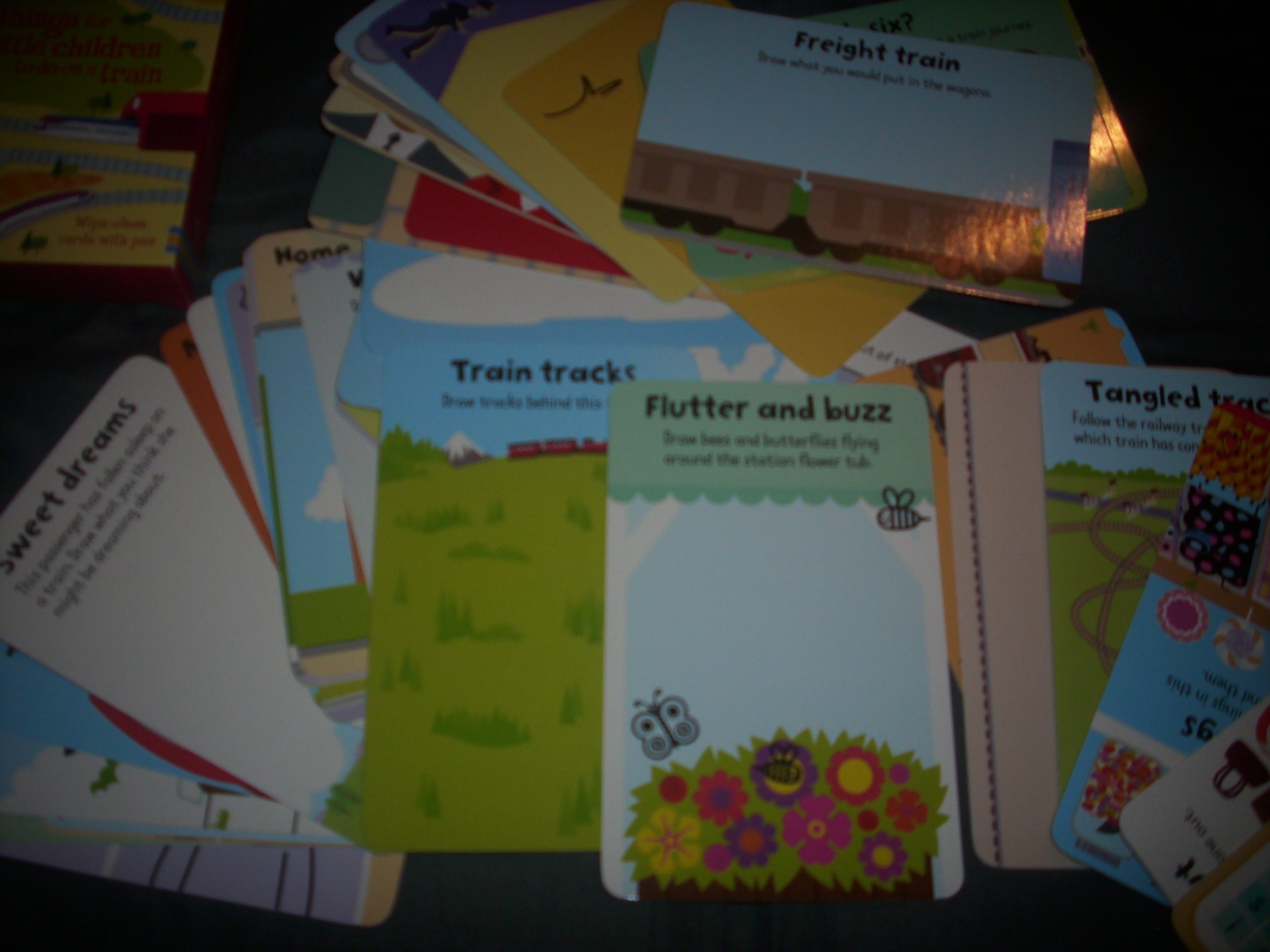 In seara aceasta, am primit primul nostru set de carduri de genul „wipe and clean” (un cadou anticipat pentru ziua lui D.): ” 100 Things to do on a Train”