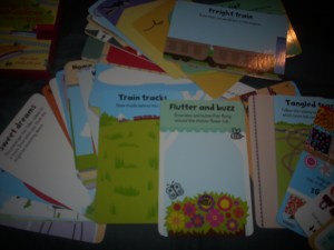 Astazi, am descoperit pe site-ul librariei Elefant. ro, un set de carduri din aceeasi serie: „O suta de jocuri pentru copii de luat si-n calatorii” (traduse in limba romana) http://www.elefant.ro/carti/carti-pentru-copii/grupe-de-varsta/iv-ix-ani/iii-de-jocuri-pentru-copii-de-luat-si-n-calatorii-169167.html.
