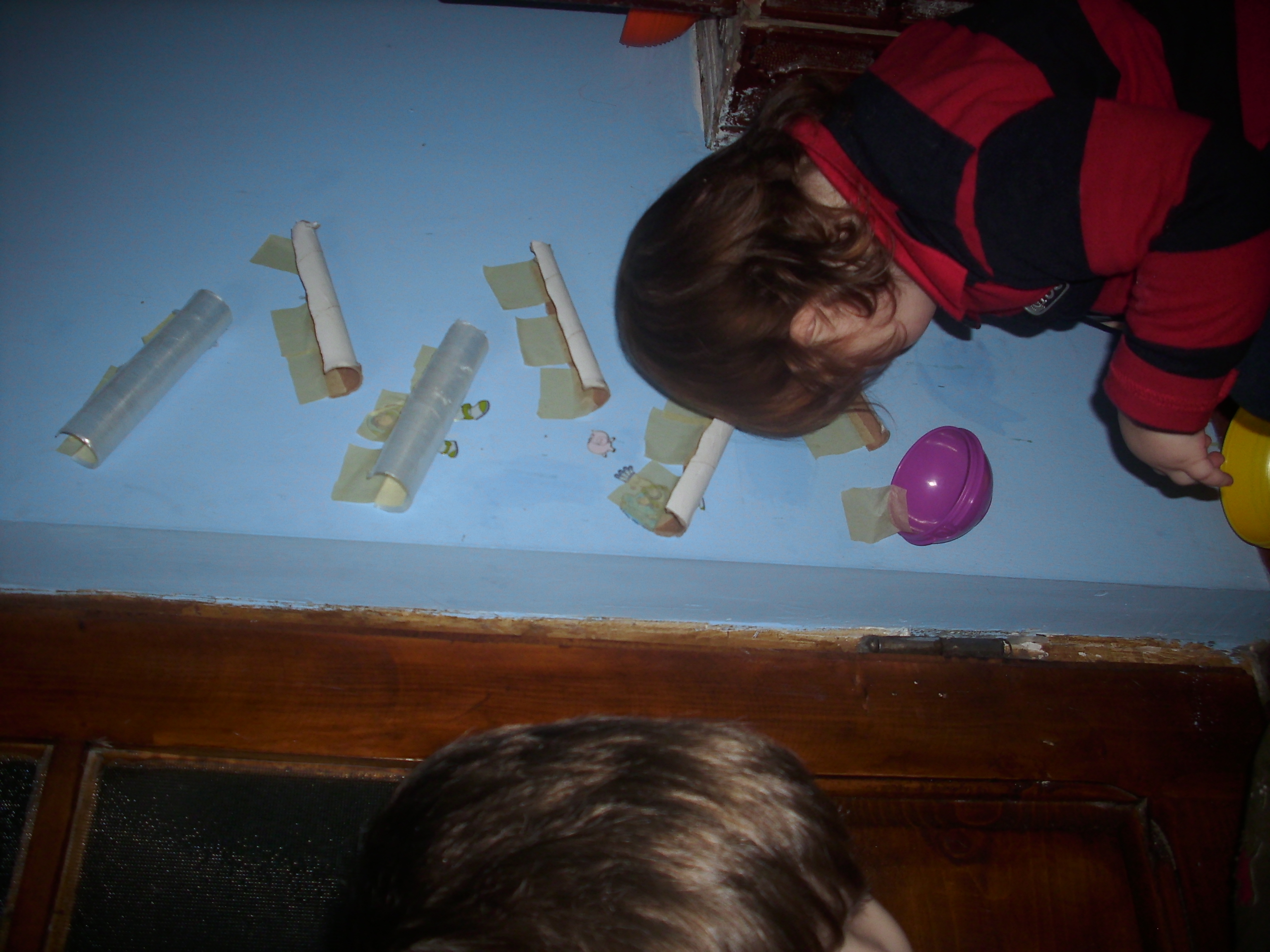 Am folosit un sul mai tare ramas de la folia alimentara. Le-am taiat in jumatati si gata traseul! A trebuit sa le aranjam foarte bine ,am lipit la unele capete scotch, altfel bilutele cadeau in cu totul alte directii, numai pe traseu nu stateau! Dar pana la urma am reusit! :)..Am pus jos si niste castronele, am facut unele improvizatii ca sa complicam traseul.