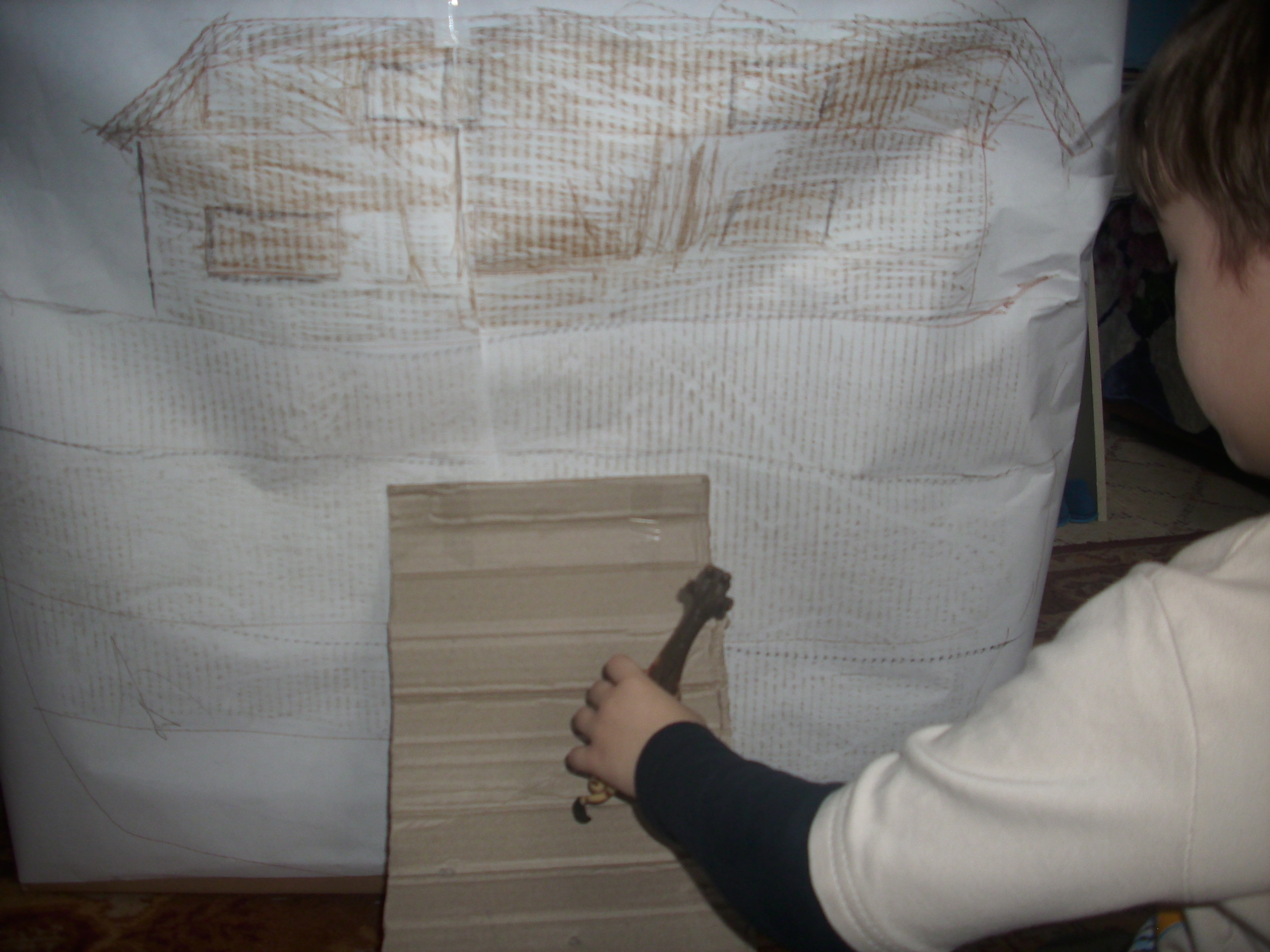 3. Am construit impreuna o corabie dintr-o cutie. Am lipit pe ea o coala alba, am facut o schita a viitoarei corabii 🙂 si uitati ce a iesit :)….ne-au ajutat si striatiile de pe cutie…s-a colorat tare interesant. Si am lipit si o scara. 🙂