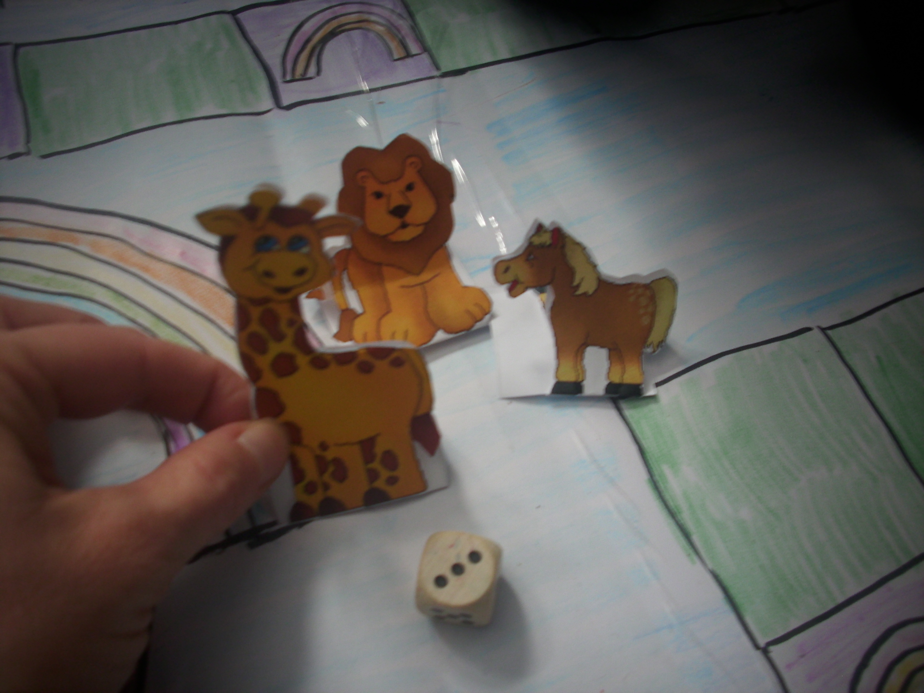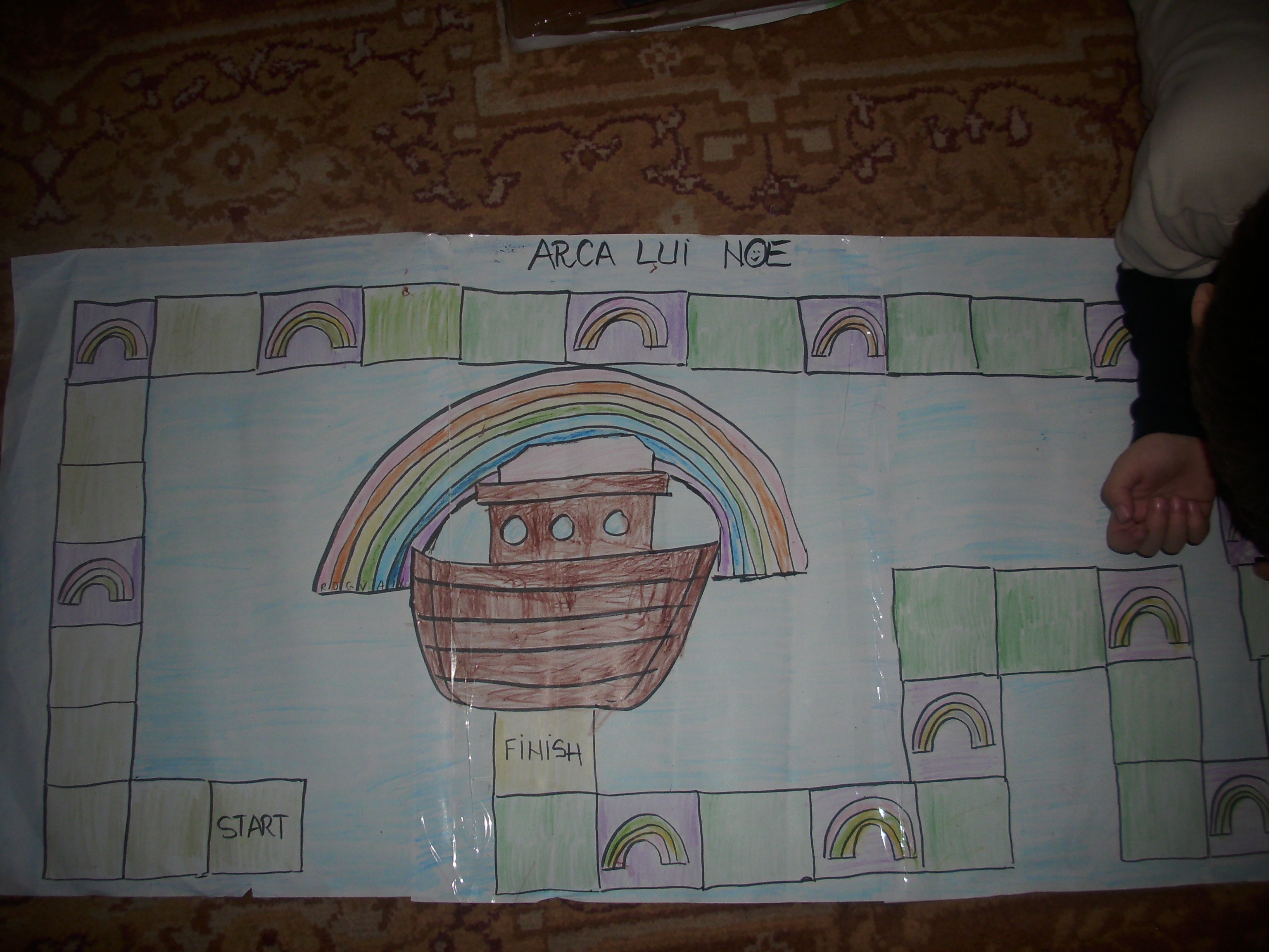 NOi am facut o plansa muuuuult mai mare, decat cea care trebuia scoasa la imprimanta, pentru ca traseul era prea scurt- jocul se termina prea repede!. Se joaca in genul  clasicului ” Nu te supara frate”. Cine ajunge primul cu animalutul in corabie a castigat. Oridecate ori intalnesti in drumul tau, un curcubeu, trebuie sa tragi un card cu o sarcina de indeplinit.