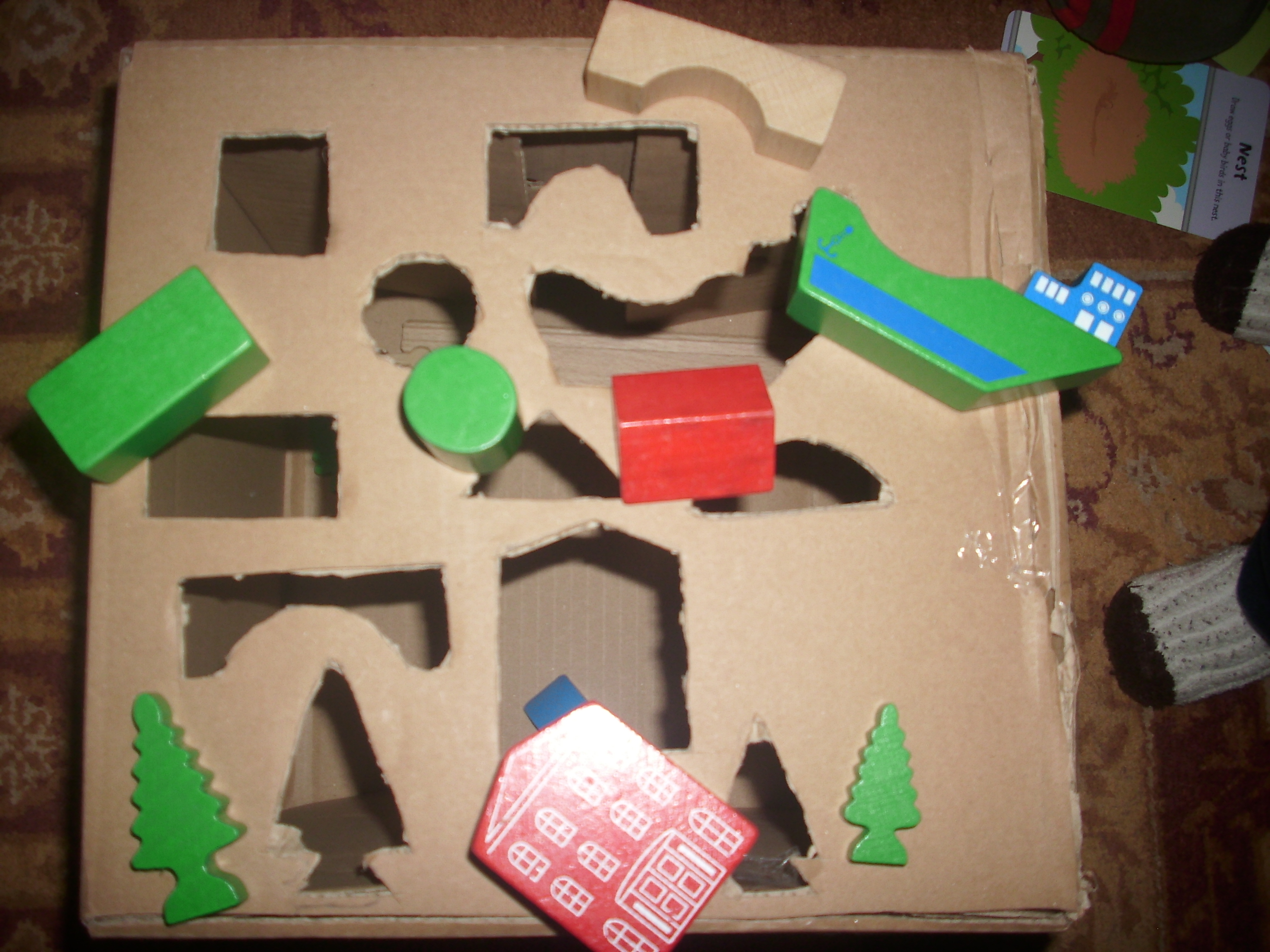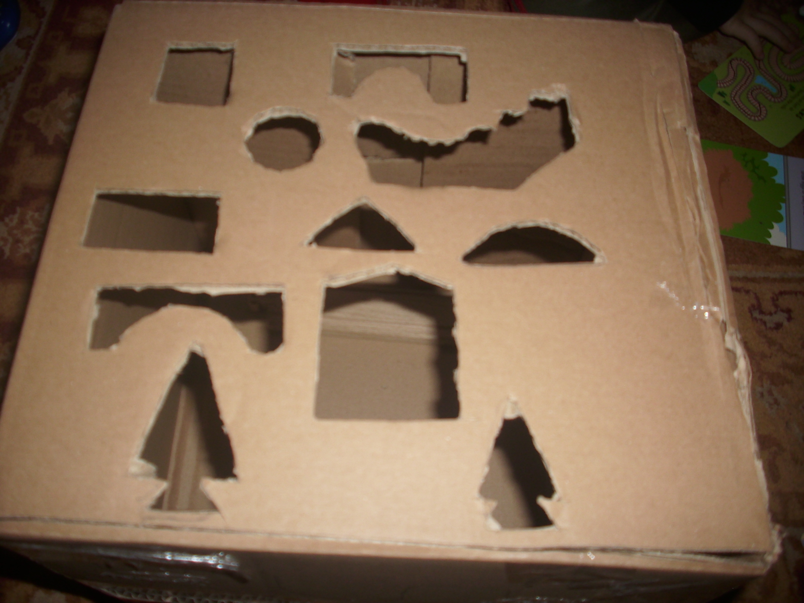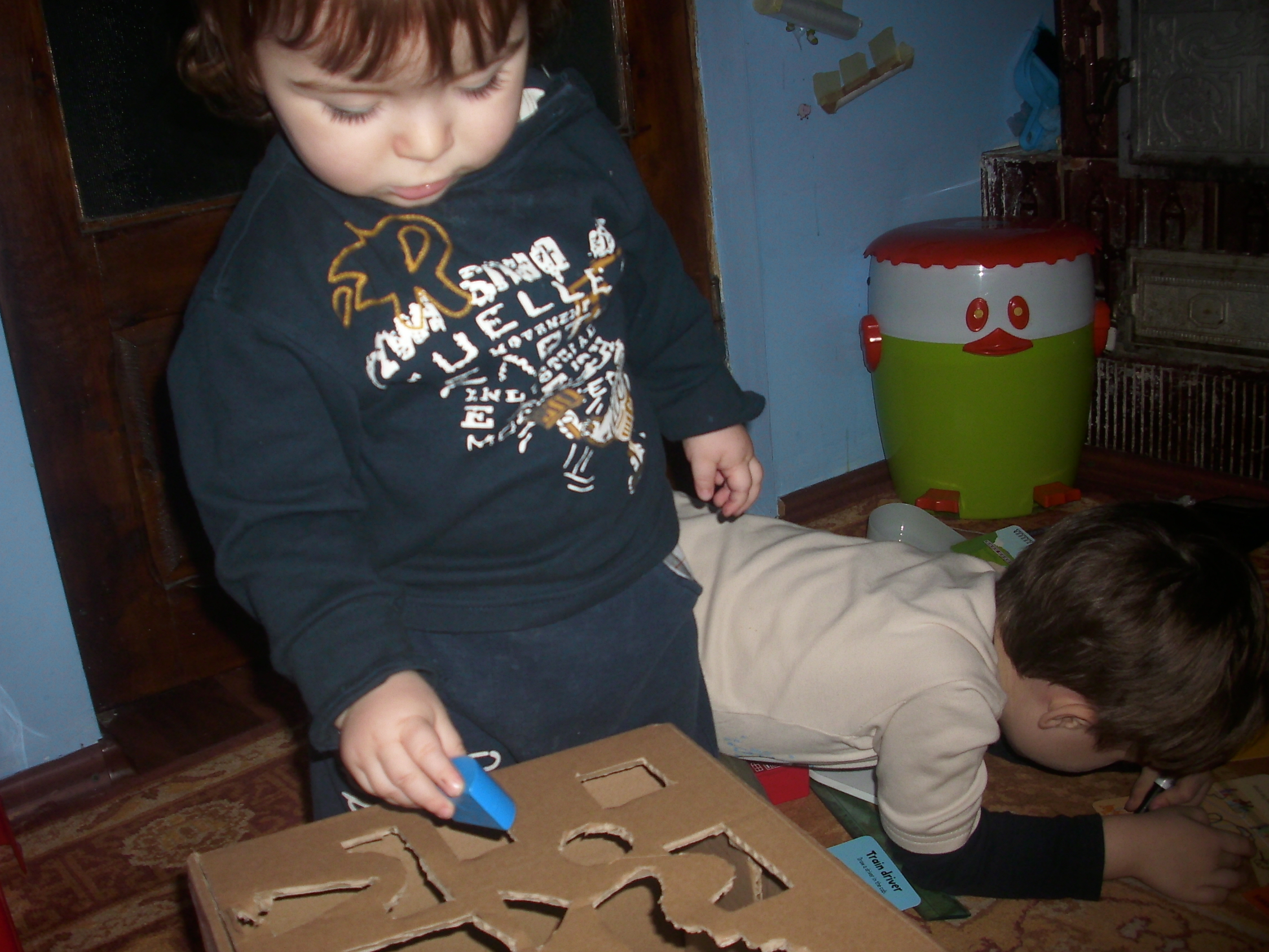 Avantajul acestui sortator urias (cutia nu era nici mica, nici mare) este ca se pot baga zeeeci de piese in ea….A. nu mai tinea cont…le introducea pe unde dorea el si cate vroia 🙂 Am reusit totusi sa-l conving sa puna corect piesele rotunde si cele patrate.
