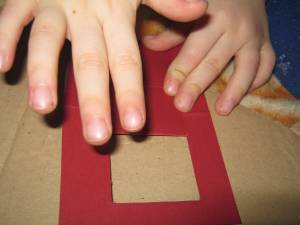 2. Taiati  un patrat  si indoiti-l pentru a forma o felicitare. Taiati o fereastra micuta cu un cutter (noi am facut-o de 4×4 cm).