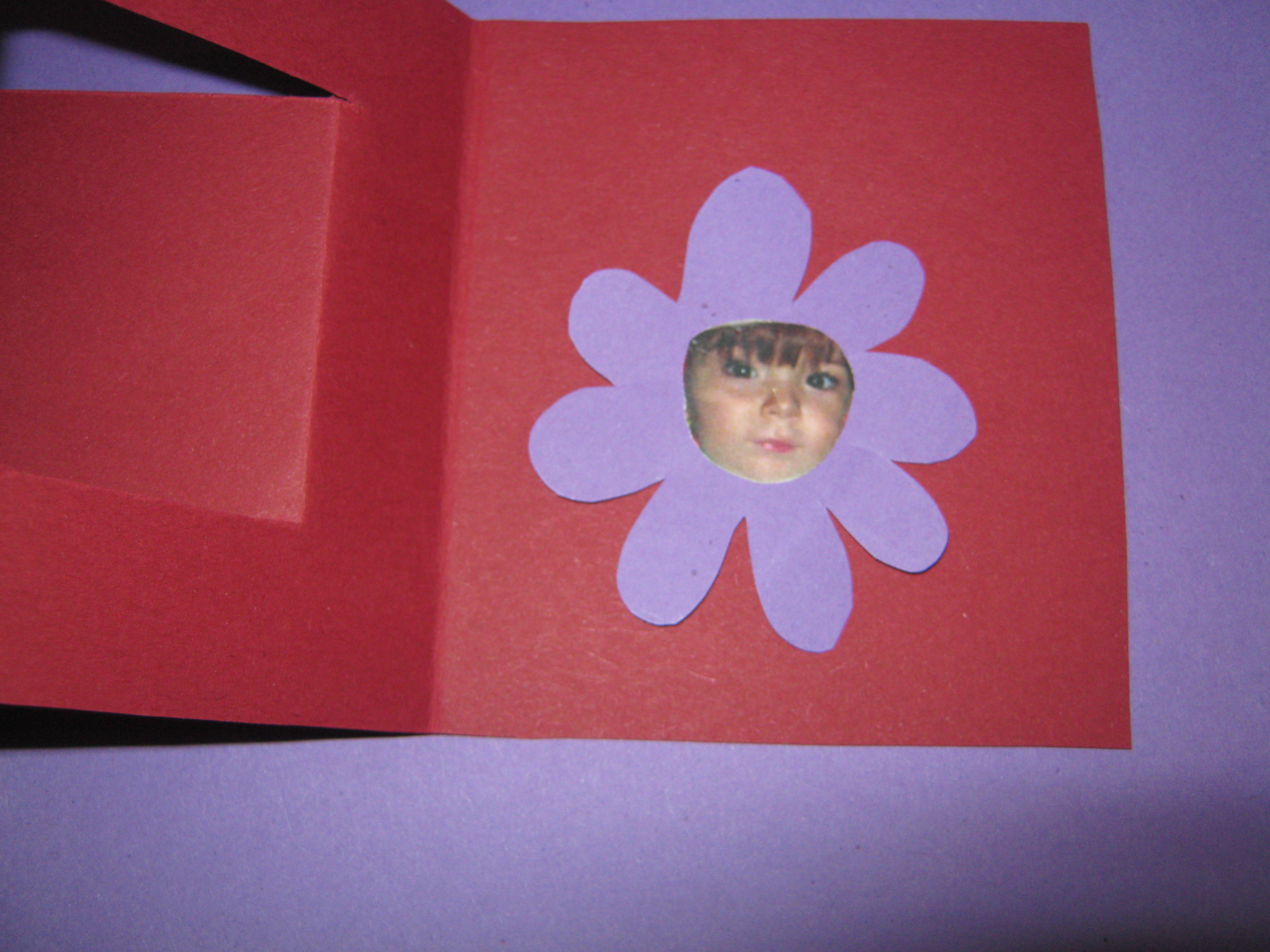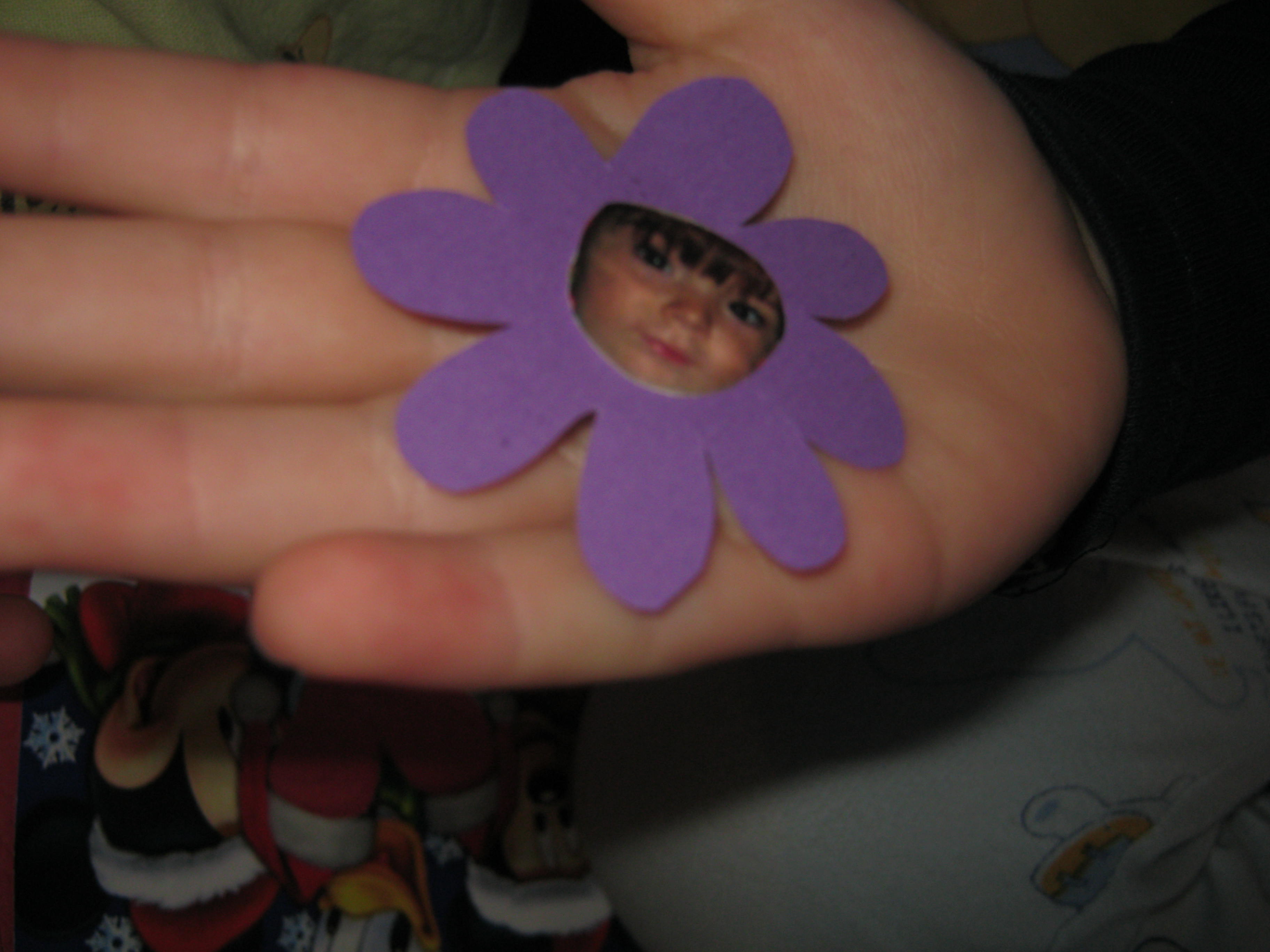 4. Am decupat din hartia cartonata colorata o floricica pe care am lipit chipul copilasului.