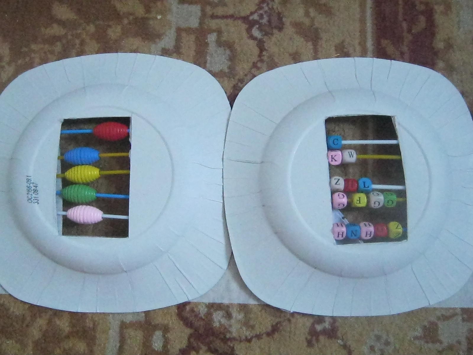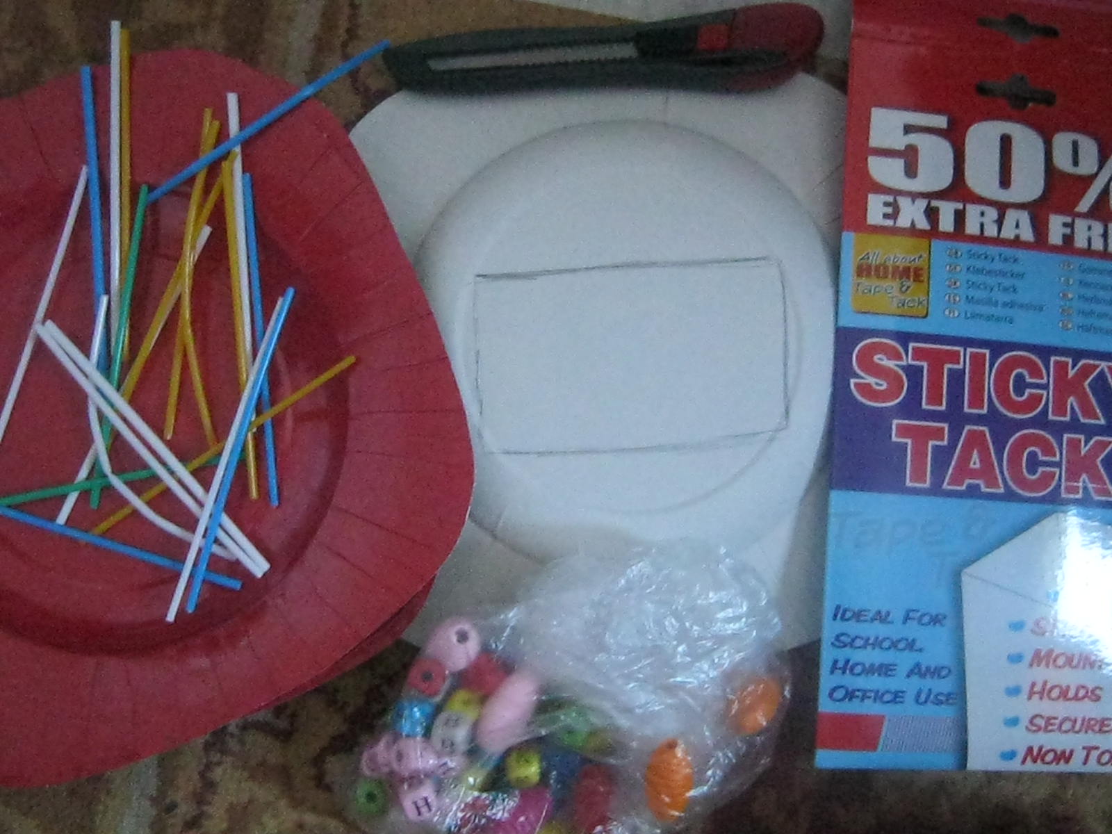 1. Materiale necesare: farfurii din carton, margele (noi am folosit din lemn), betisoare, banda scotch, cutter.