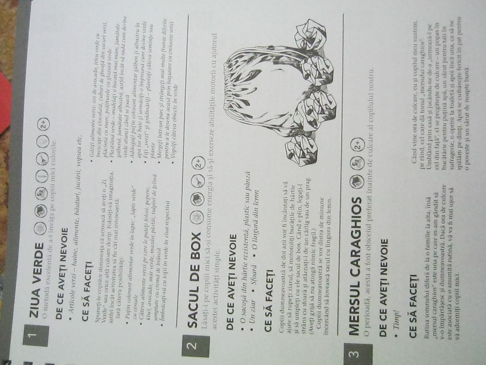 Fiecare activitate contine o lista scurta cu materialele de care aveti nevoie inainte de a incepe. Cel mai adesea este vorba de articole obisnuite din gospodarie, pe care le aveti deja la indemana…