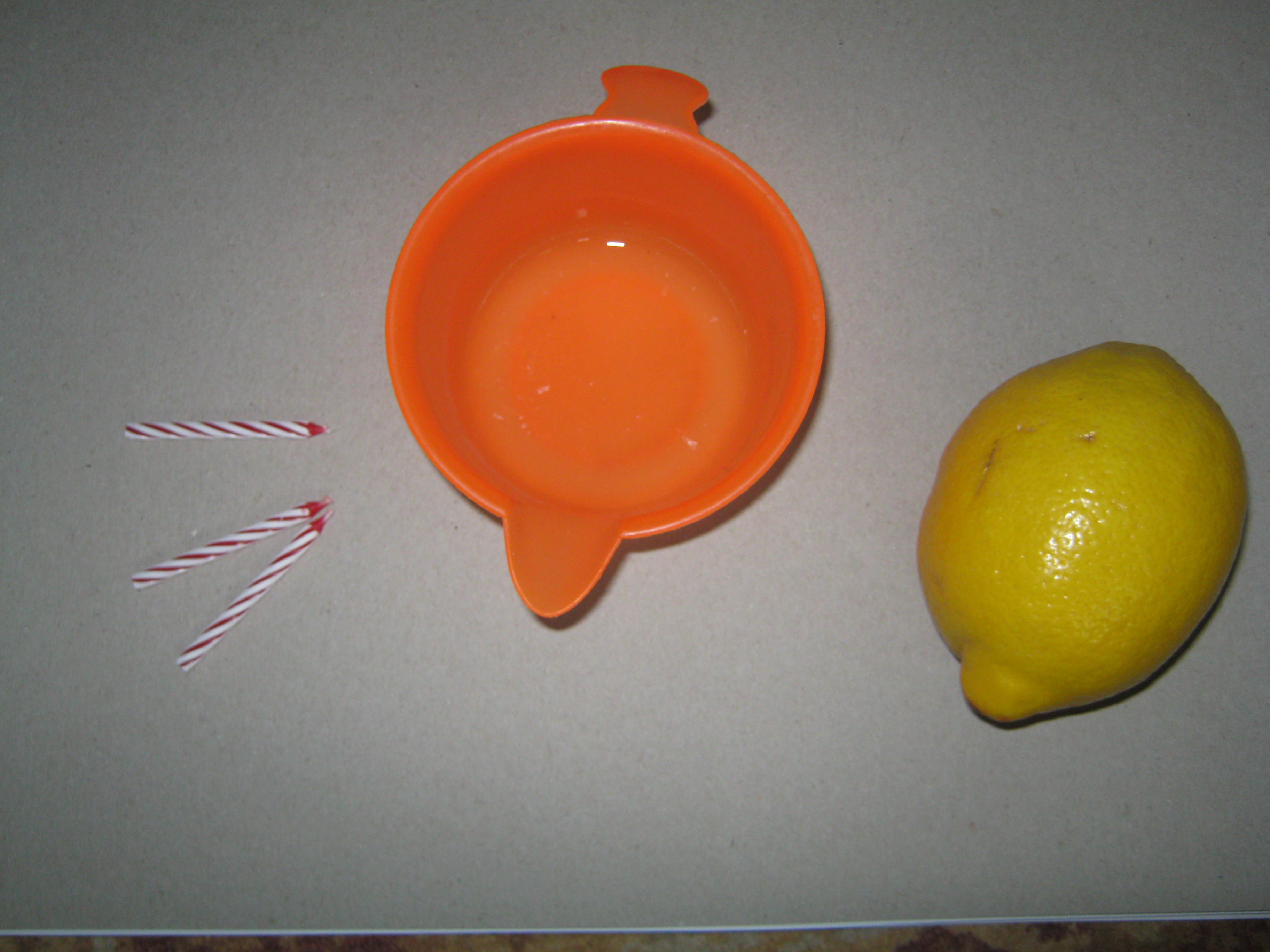 Aveti nevoie de suc de lamaie si „ceva” -un instrument de scris (merge si un creion din lemn fara mina). Noi am folosit lumanari de tort, au fost foarte bune pentru aceasta activitate.