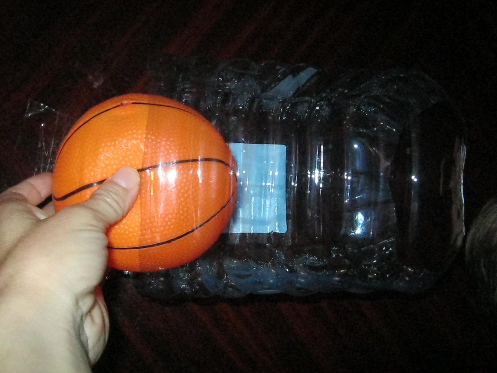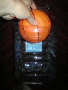 Aveti nevoie de o minge mai mica si usoara si de un bidon mare de plastic (noi am folosit unul de 5 litri).