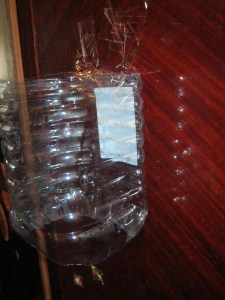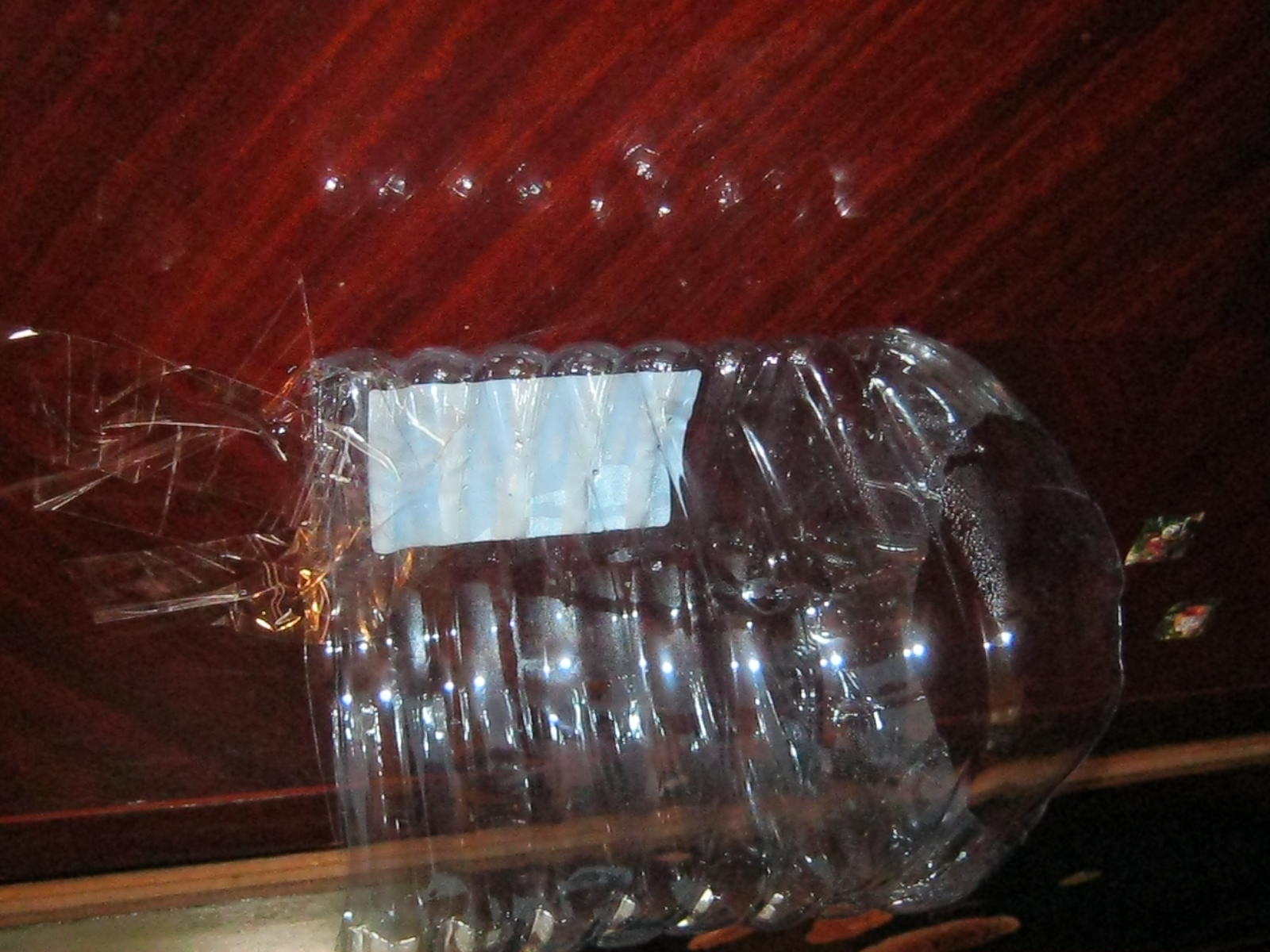 Se taie bidonul in partea de sus si cea de jos ca in poza noastra. Ca sa nu se zgarie cei mici, se poate lipi pe marginile taiate banda de scotch sau banda de mascare.