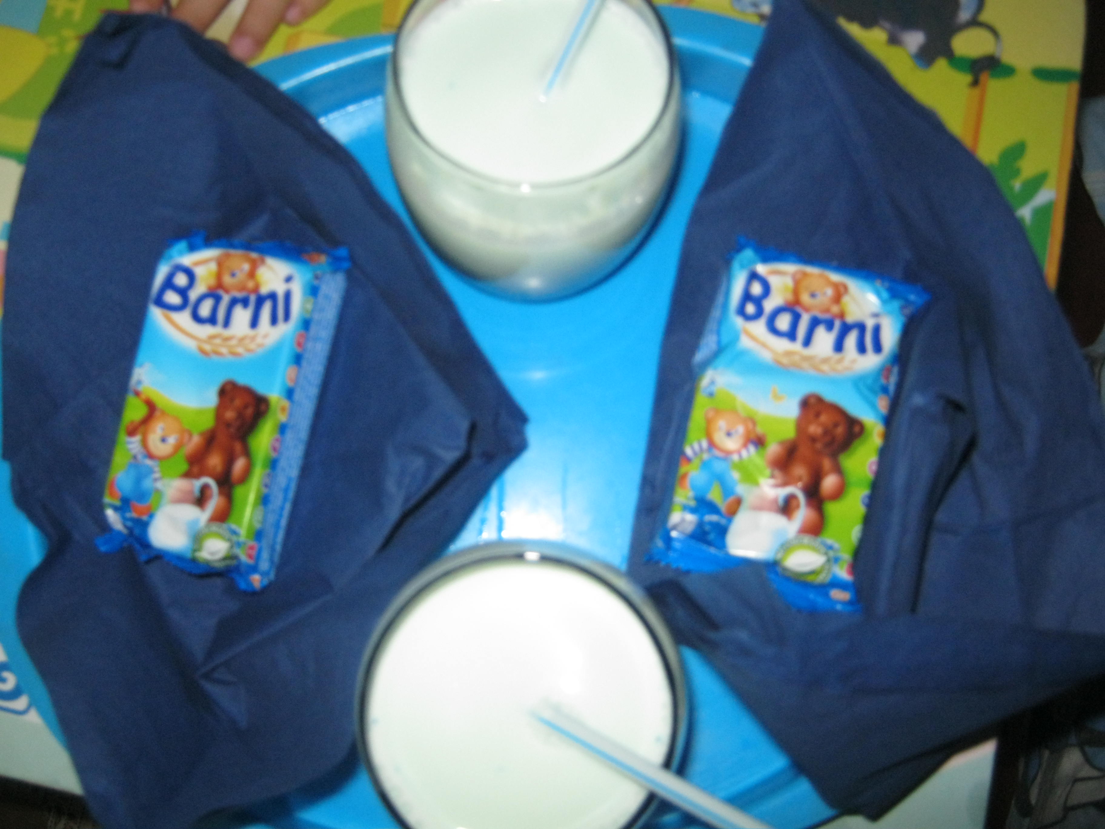 A urmat un mic dejun albastru:) – pe o tavita albastra, am pus doua pahare albastre cu lapte albastru (am picurat in el o picatura mica de albastru de metil), am facut doua servetele barcute in care am asezat doua prajiturele Barni cu ambalaj albastru.