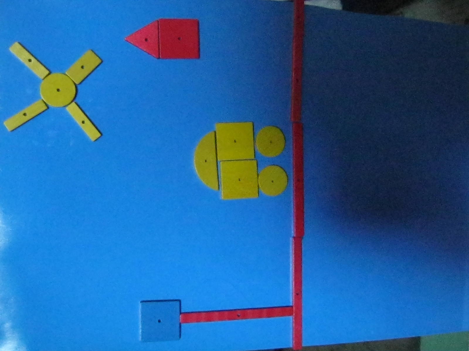 Le-am facut fiecaruia o masuta si am asezat-o vertical. Le-am dat formele din lemn de la cutia cu ciocanel si cuie si i-am lasat sa lipeasca formele cum vor.