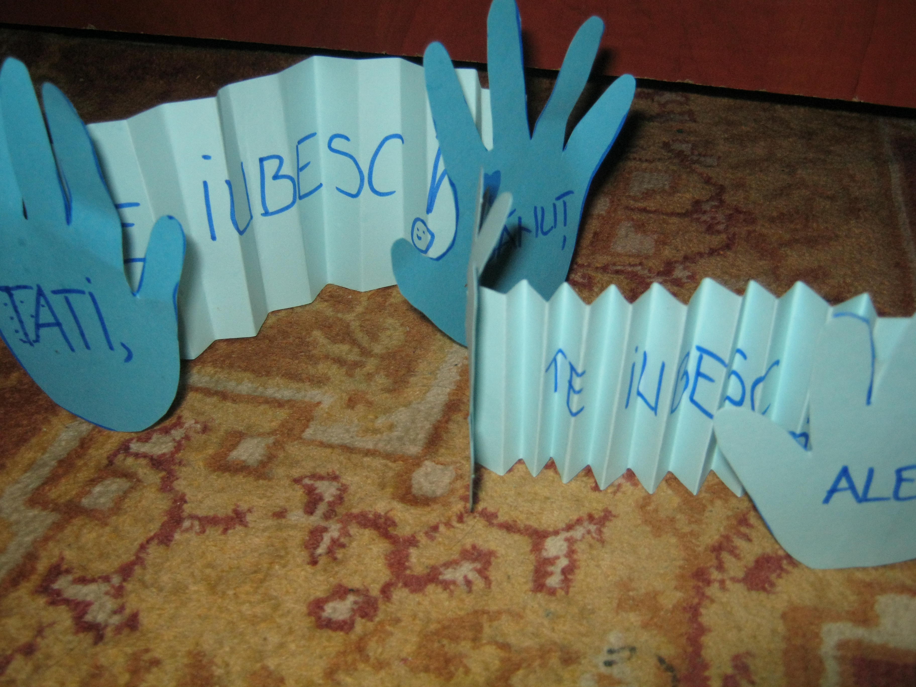 Nu l-am uitat nici pe tati si am facut felicitarile vazute la Roxana. Ei m-au ajutat doar cu pusul manutelor si a abtibildurilor mici. Dar au fost foarte fericiti sa i le daruiasca cand a venit de la serviciu.