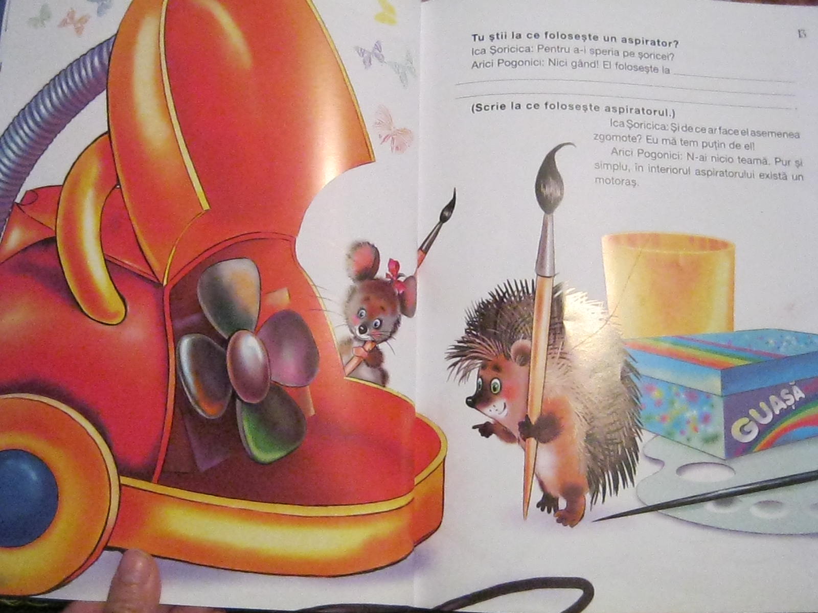 Si chiar si A, dupa ce a ascultat prima poveste cu aspiratorul, dupa doua zile, vazand cartea…a dus-o la tati si i-a spus : „nu hica apiato ica cica” (ati inteles voi 🙂 -nu frica aspirator la ICa soricica)