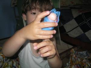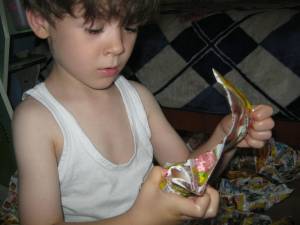 LA inceput, A. ma ruga pe mine sa desfac hartiuta…l-am incurajat sa incerce singur si sigur , s-a descurcat foarte bine.