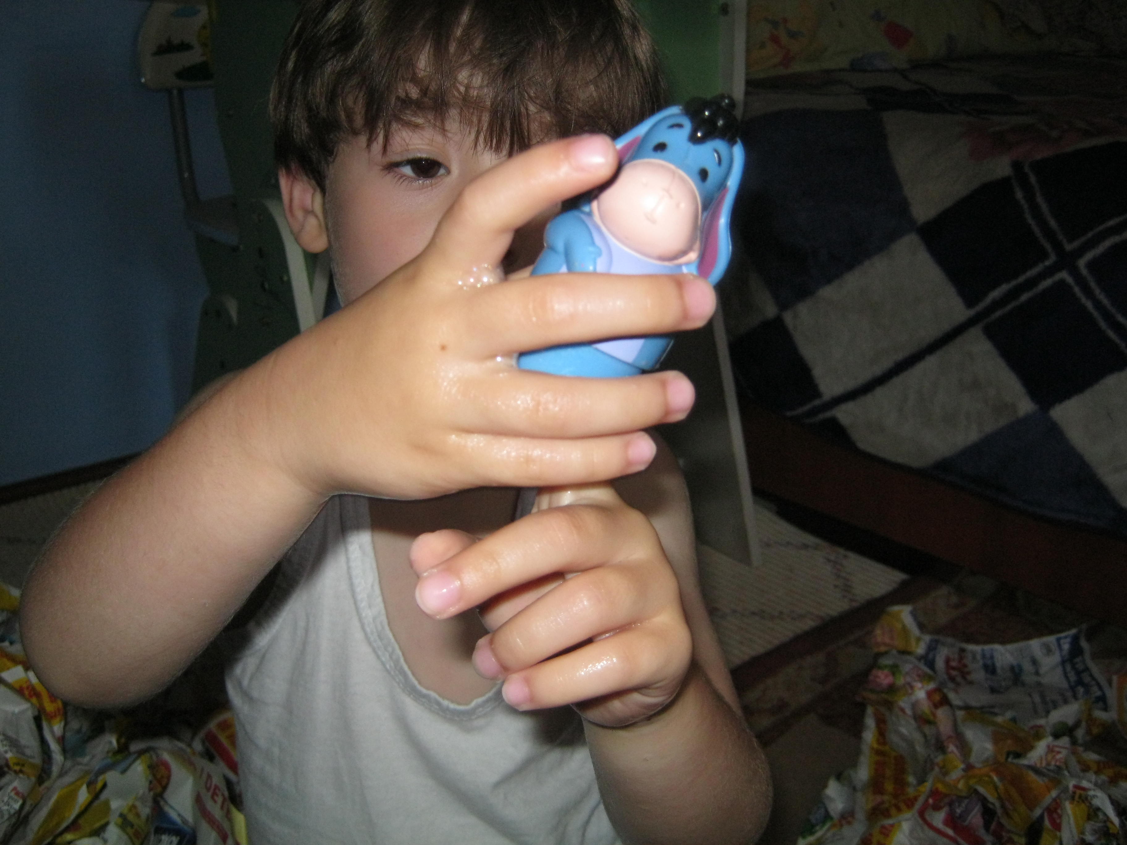 Am adus cutia si le-am spus sa desfaca singuri suprizele de acolo, una cate una si apoi sa le bage in oala mare cu apa si sa le spele. A fost o adevarata placere pentru ei : atat descoperirea pieselor noi , ce erau ff interesante , cat si spalatul lor- stiti vreun copil caruia sa nu-i placa sa se balaceasca in apa ? (nu ma refer la spalatul pe cap :D.