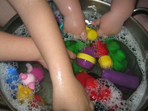 Daca va place ideea, puteti impacheta jucarii mici (poate acelea pe care nu le-au mai vazut de mult timp) , le puneti in cutie si le oferiti celor mici o ocupatie de cel putin 30 de minute. Si, sigur daca ii  puneti sa le si spele, succesul e garantat. 🙂