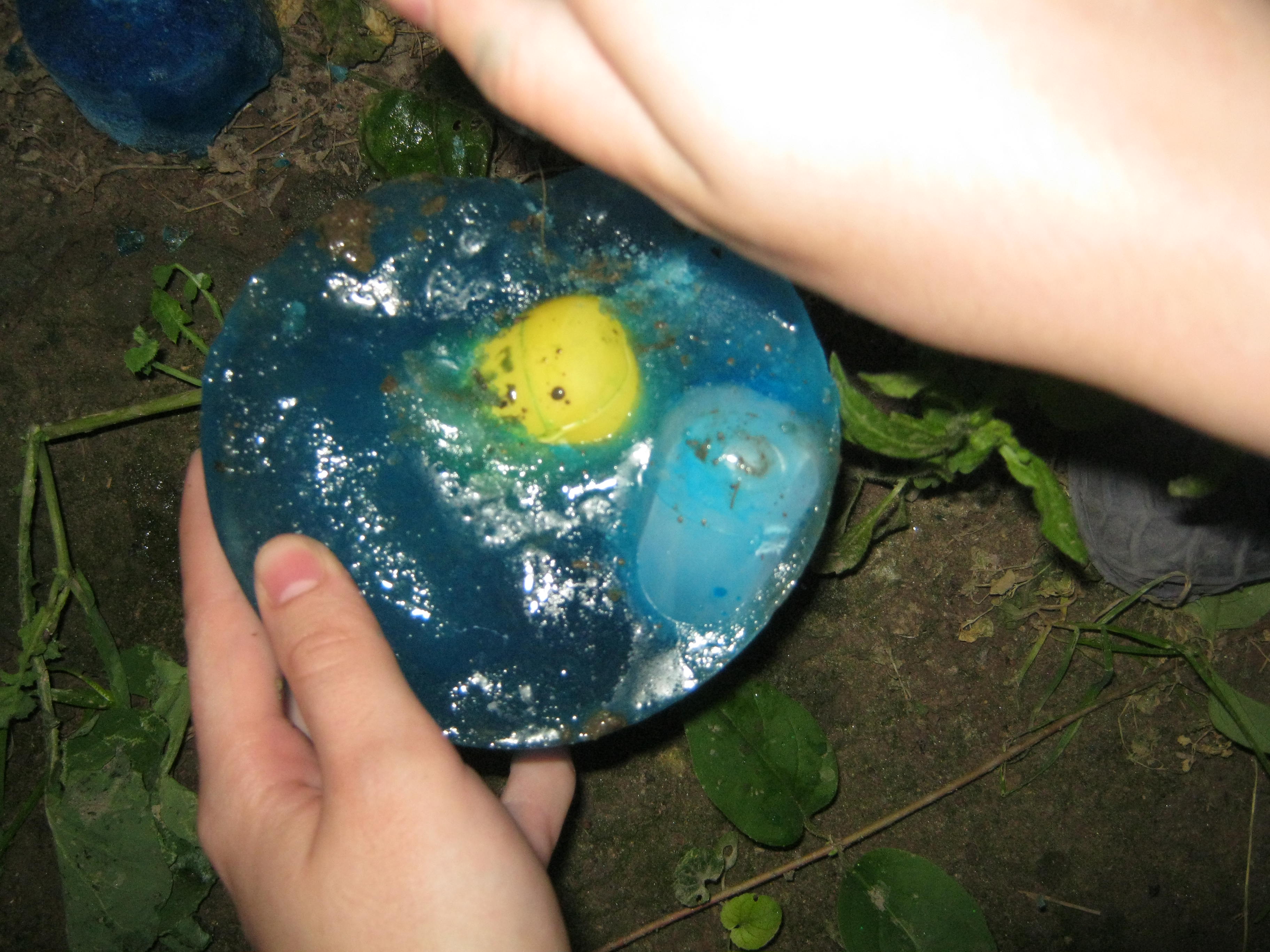 Cand au descoperit-o au ramas muti de uimire!! „Wooooow!!! Ce e asta??” PUsesem acolo o multime de bucati mari de gheata albastra in care am ascuns oua din plastic cu indiciul urmator. Dar ca sa ajunga la ou, trebuiau sa munceasca serios. Si ce s-au mai chinuit! Aveau mainile inghetate…asa ca mi-a fost mila de ei si le-am adus apa calda si am turnat si peste mainile lor si peste gheata.