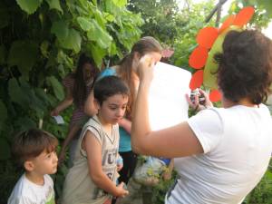 Acolo ii astepta o floare vorbareata (am facut un fel de floare de pus pe cap)…si  I. s-a oferit sa ma ajute :)…ce nu facem noi pentru copii ?