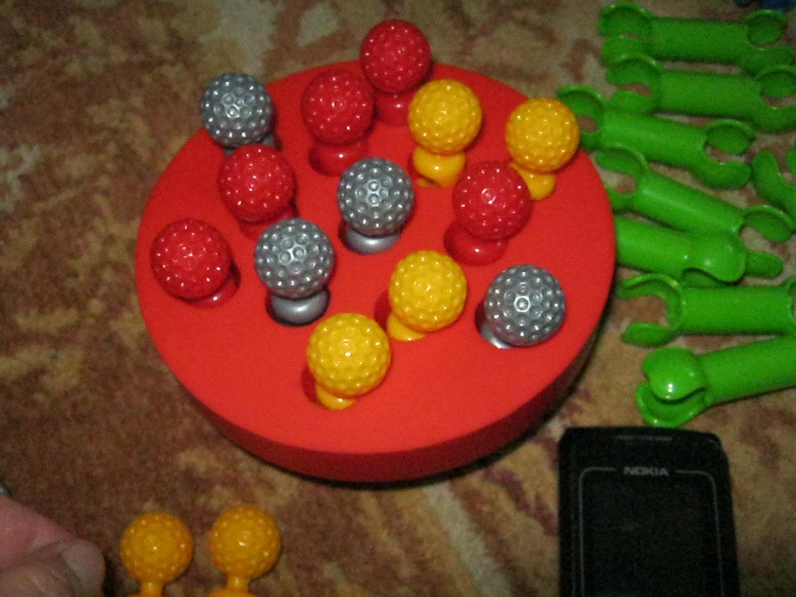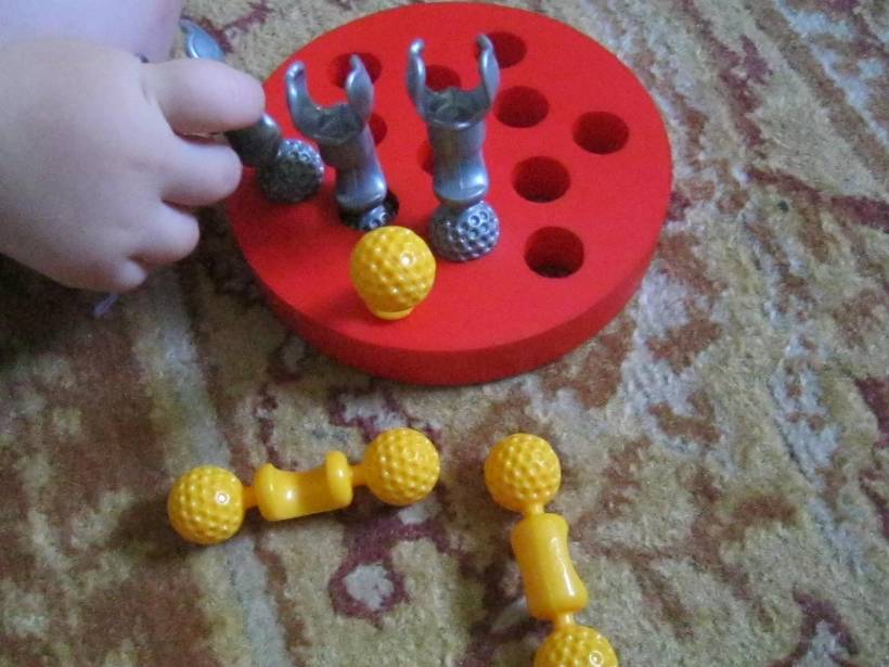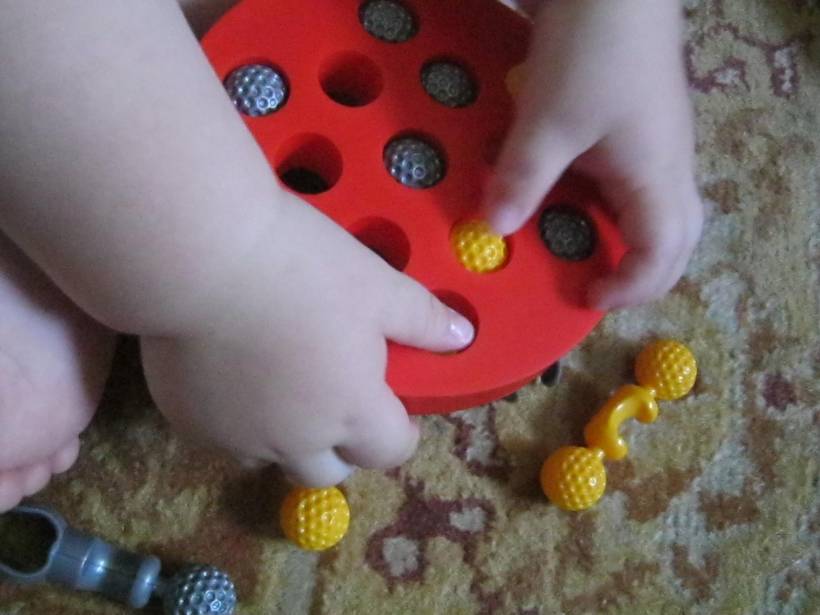 Nu se mai satura sa introduca capetele rotunde ale pieselor si cand termina si le scoteam de acolo, o lua de la capat. Un bun exercitiu pentru degetelele lui! 🙂