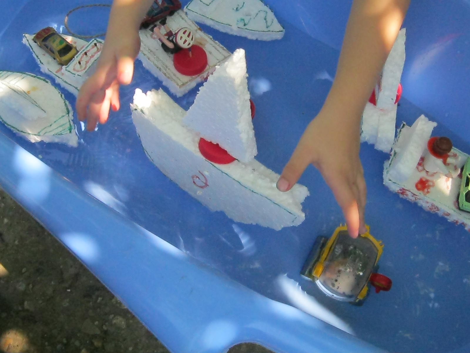 Am luat un bidon de 5l, l-am umplut, i-am gaurit bine capacul si …. o ploaie binefacatoare a udat atat vapoarele, cat si omuletii si manutele jucause ale ursuletilor. 🙂