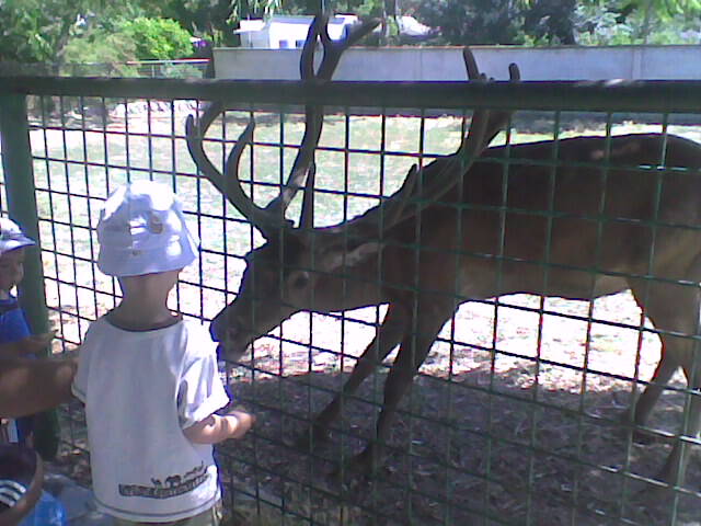 Cand ne-am intors…indreptandu-ne spre iesire, am auzit un barbat ce tinea de mana un baietel mic strigand:” Cristiaaaan! Cristiaaaan!”. MA gandeam ca striga vreun copilas….ei, dar sa vedeti minune! 🙂 Auzindu-l, cerbul, a iesit repede din  ascunzatoarea lui si s-a apropiat de gard…era atat de prietenos :). Domnul ii adusese biscuiti…si cerbul era tare incantat de aceasta gustare. Le-a dat si micutilor mei biscuiti ca sa il hraneasca.  Lui D. nu-i venea a crede ca poate sta asa de aproape de el. I-am vazut si coarnele puternice si acoperite in intregime de puf, zici ca erau din catifea. Bineinteles, cerbul se afla dupa gard…veti vedea…