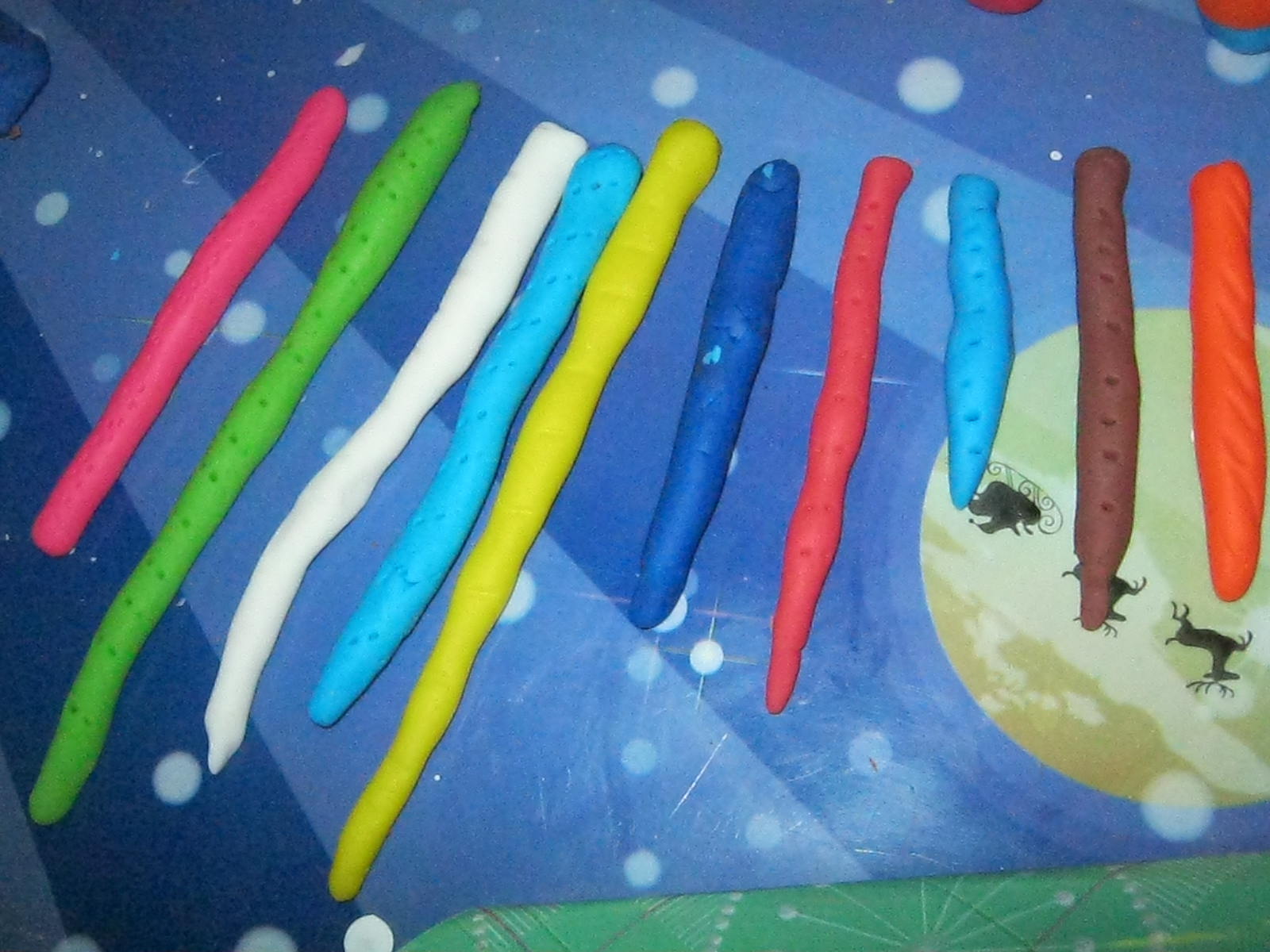 Astazi ne-am amuzat, facand tot felul de viermisori din plastilina. Scopul meu a fost sa le fac corpurile de diferite marimi pentru ca D. sa le aranjeze in ordine.