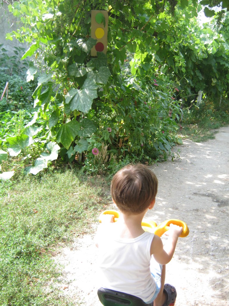 Am amenajat si un traseu. Am pus din loc in loc indicatoare de circulatie colorate de D., un mare semafor, am desenat cu creta si doua mari treceri de pietoni.