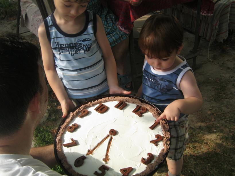 Asa ca i-am daruit un maaaaare ceas …copiii au fost tare incantati de cifrele din ciocolata…”Woooow!! chiar le putem manca???” 🙂 Asa ca fiecare copil nazdravan, a primit o felie cu cu cifra ce indica cati ani au ei :)….mai greu a fost cu noi cei mari….nu aveam cifre indeajuns pentru varsta noastra :D.