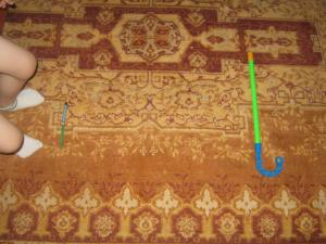 I-am delimitat spatiul: de unde sa sara si desi nu era nevoie, i-am pus acelasi bat colorat in fata pe care cu fiecare saritura il indepartam. El, avandu-l in fata, incerca sa sara cat mai lung. De fiecare data, ii masuram cu centimetrul sariturile (asa ca la concursurile adevarate) si a fost tare incantat de idee. Recordul lui a fost de 100 cm…saritura de pe loc . IL vom invata ( zic la plural, pentru ca il va invata tati) cum sa sara prin alergare.