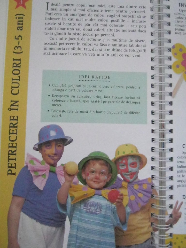 Am oferit multe idei si pentru familiile ocupate si am propus cateva sugestii legate de modul in care copilul te poate ajuta la pregãtirea petrecerii. Toate ideile noastre iau in calcul bugetul unei familii, asa ca nu vei gasi costume de designer sau mancaruri extravagante. Poti alege fie sa adopti tema completa, in care sunt incluse jocurile, invitatiile, decoratiunile, costumele, mancarea sau pungile de cadouri, fie sa selectezi ideile tale preferate din diferite petreceri, pentru a crea un eveniment cu totul nou.
