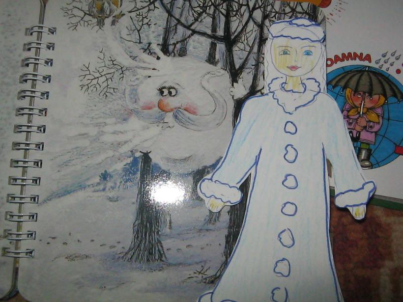 ” eu sunt Iarna. Cand domnesc eu, totul este acoperit de zapada cea alba si pufoasa. Afara este atat de frig, incat trebuie ca toti sa se imbrace foarte bine. Zilele sunt tare scurte si noptile reci si lungi. Dar, copiii ma iubesc caci le plac mult jocurile de iarna si Craciunul” 🙂
