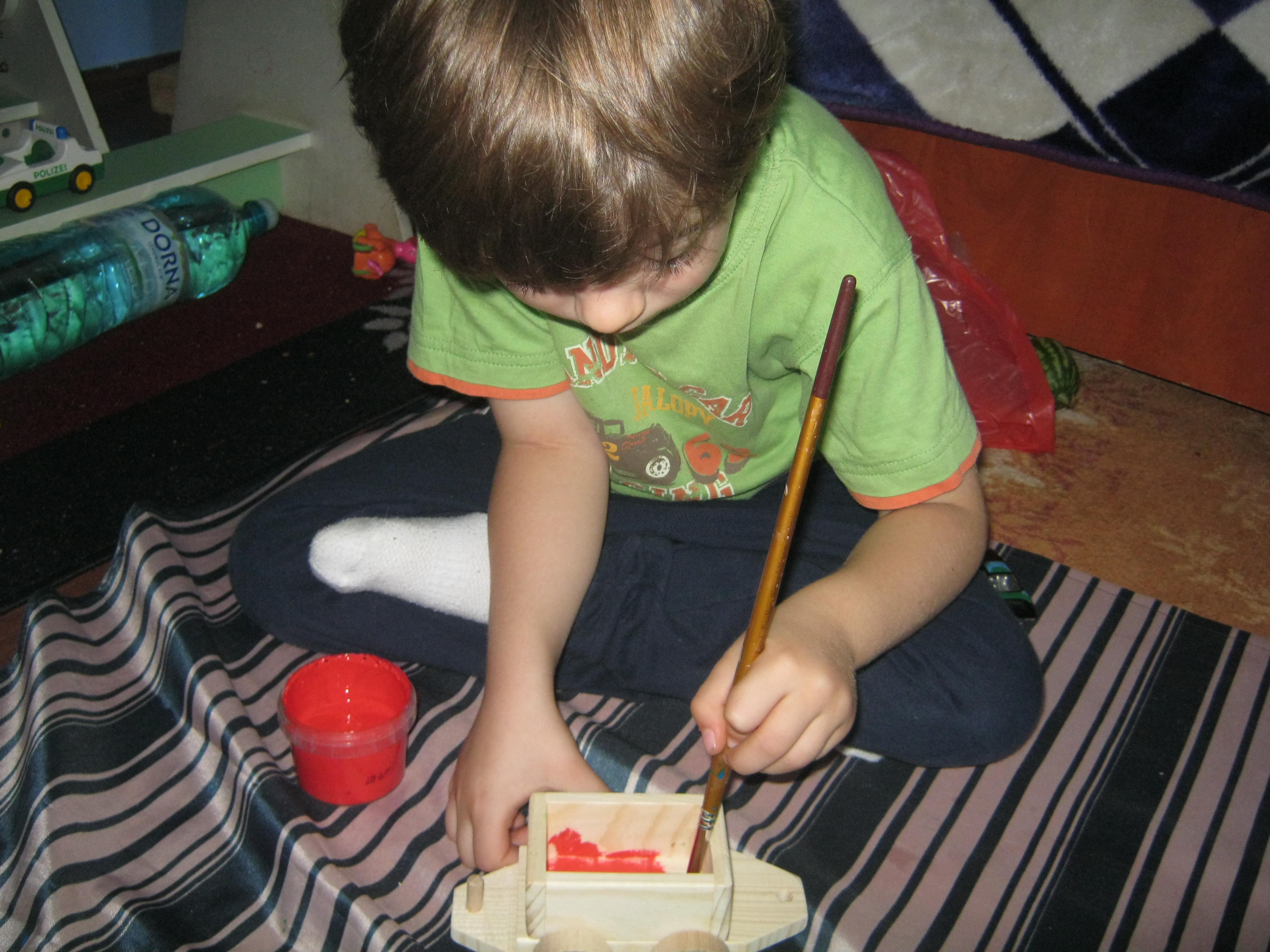 Ne-am pregatit pentru decorarea trenuletului- l-am vopsit cu acuarele fingerpaints…erau pe baza de apa , deci au aderat bine pe lemn….nu ne-am permis sa luam ceva special,d ar a fost tare bine si asa. 🙂
