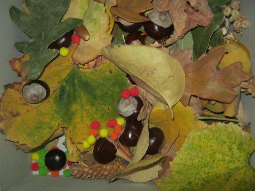 Asa ca, peste ceva timp s-au intors cu o cutie plina de tot felul de minunatii tomnatice: frunze (de gutui, par, corcodus, cires, vita de vie, ), seminte de stevie, castane, ghinde, nuci. D. a ales si bilute mici, pufoase din plus de culoare galbena, portocaliu si rosu si le-a strecurat printre frunze. Da, a strecurat si cateva verzi, ca a vazut el bine ca inca nu au cazut frunzele verzi din copaci. 🙂