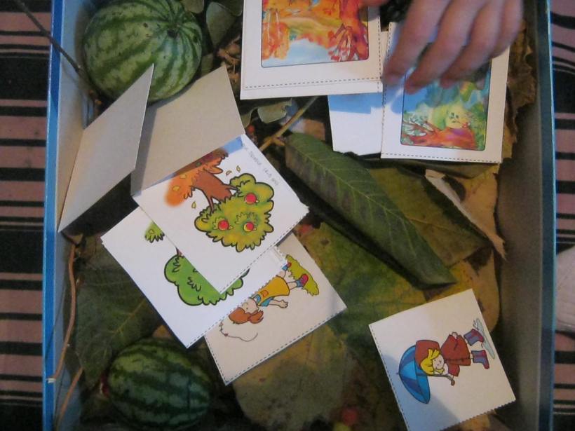 Mama a ascuns printre frunze si o multime de cartonase si D. i-a spus lui A. care au simboluri de toamna.