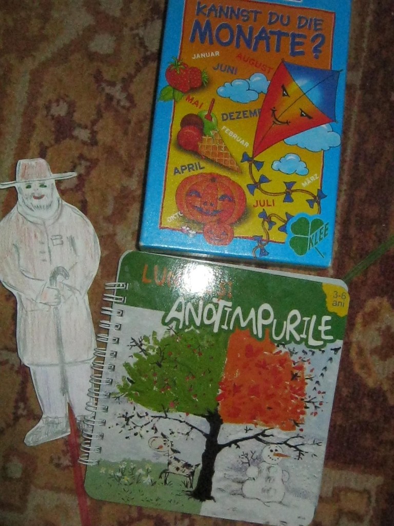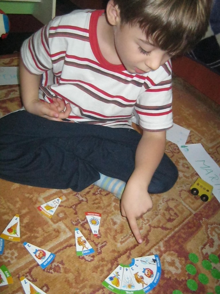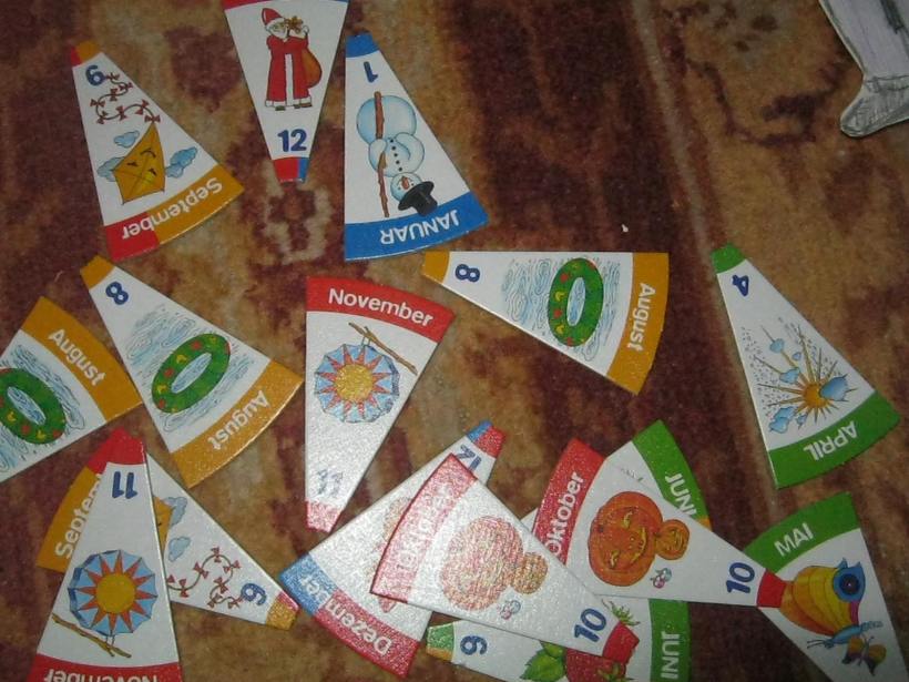 Ne-am jucat apoi jocul cel nou despre lunile anului. Erau o multime de cartonase sub forma de „felii”-sferturi… Lunile aveau si denumire, dar erau si numerotate. Sigur D. nu s-a uitat la denumire(oricum era in germana) , ci la numere :). L-am provocat la un mica competitie: cine termina primul de facut un calendar: el sau eu ?:) Si cum se puteau face cate 4 calendare, am jucat jocul de doua ori.