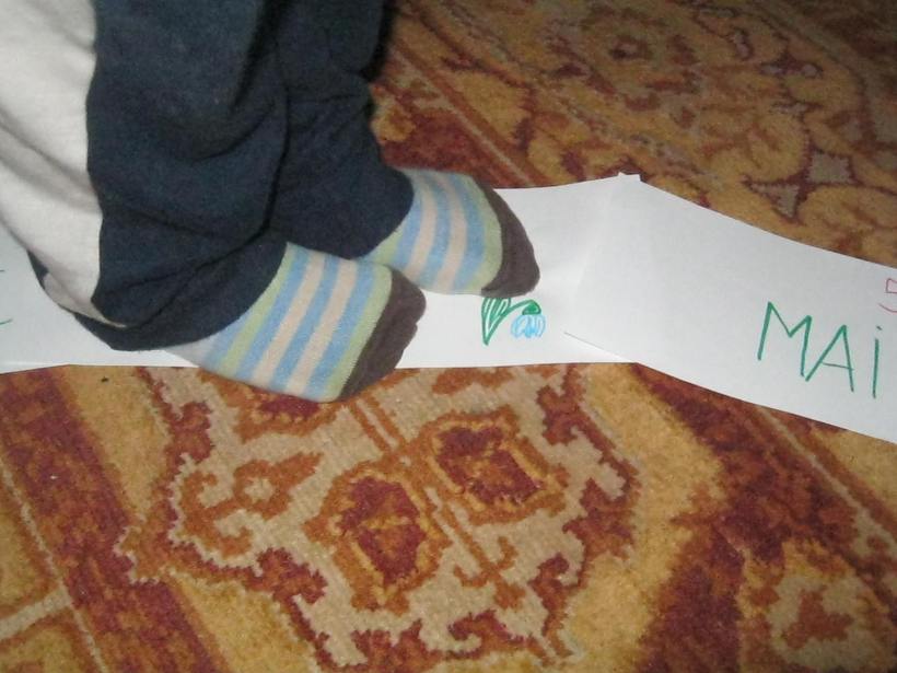 L-am pus sa mearga cu picioarele, calcand pe cartonase de la o luna la alta, facand astfel si el calatoria globului nostru in jurul soarelui 🙂