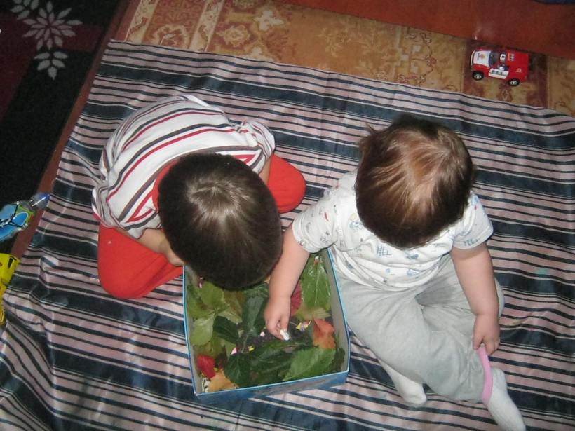 S-au distrat cotrobaind prin orez in cautarea bucatelelor de radiera si au inceput sa le imbine, de fapt D. le facea si A. se juca cu ele.