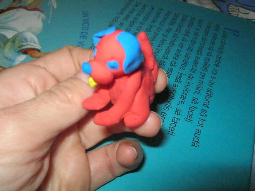 Si, l-am ajutat sa faca singur un catelus. L-am facut rosu (pentru ca nu mai aveam alta culoare )..dar, pentru ca tot imi spunea ca nu exista catei rosii :)), i-am adus aminte de desenu animal cu Clifford, catelusul rosu :).