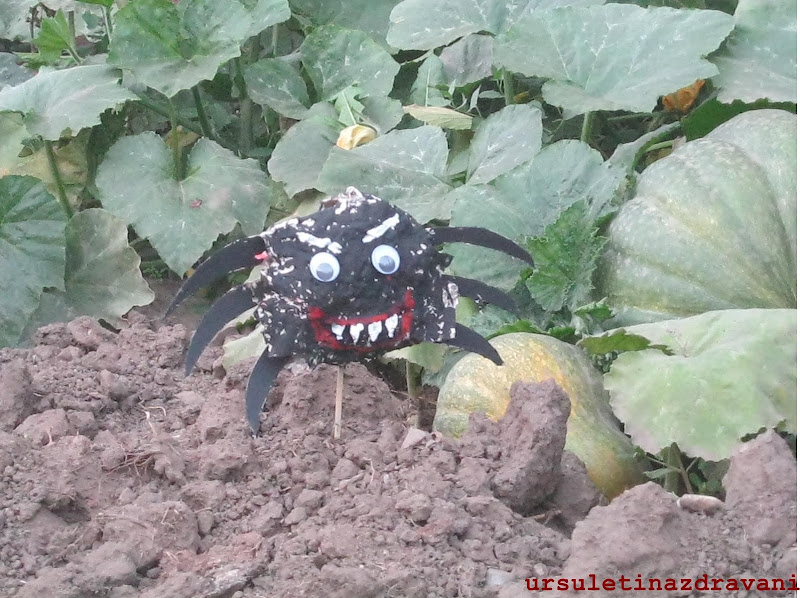 D. a vazut la Art Attack o idee draguta – cel care prezinta emisiunea facuse niste sperietori de pus in ghiveci. Asa ca s-a gandit sa faca si el una pentru gradina noastra de dovleci. Nu-i asa ca e de-a dreptul fioroasa? 🙂 Am facut-o din ghemotoace de hartie prinse cu scotch, peste acestea am pus o pasta facuta din aracet diluat cu apa si bucati mici de ziare. Am pictat totul si gata sperietoarea (este un paianjen , daca nu v-ati dat seama, trebuia sa aiba 8 picioare, nu-i asa? )
