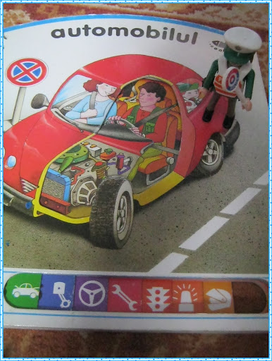 Inainte de a aduce omuletii Playmobil care sa fie cei care vindeau sau cumparau masinile, un politist ne-a invitat sa facem un mic curs despre masini. Aceasta carte am citit-o de vreo 10 ori, dar tot o indragim.