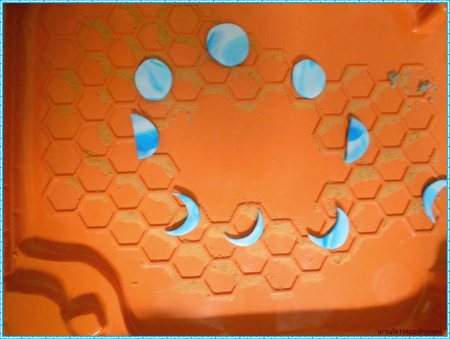 A urmat o micuta joaca senzoriala…am facut fazele lunii din argila si le-am ascuns in moon sand. Si A. a fost tare preocupat sa le tot scoata si sa le aseze.