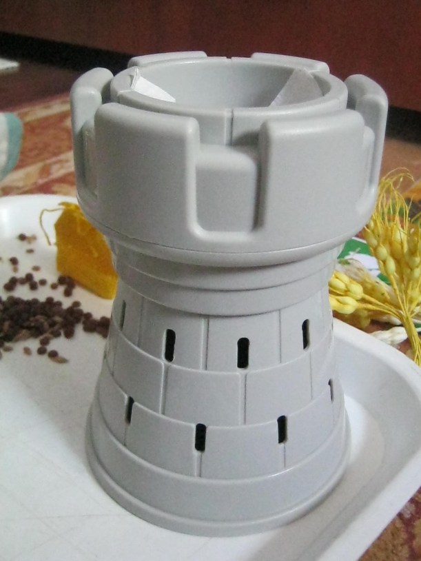 La moara (am folosit un turnulet de la jocurile noastre), boabele au fost macinate si transformate intr-un praf alb, fin ce se numeste FAINA.