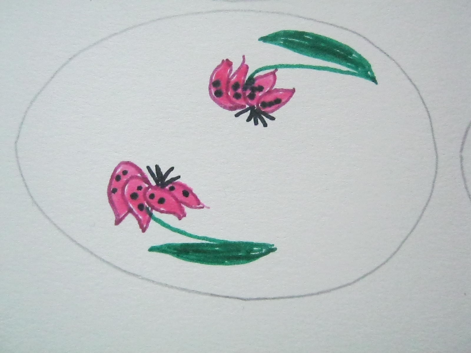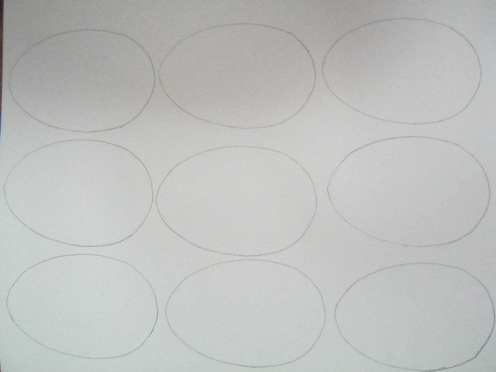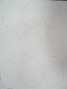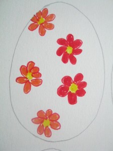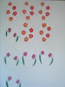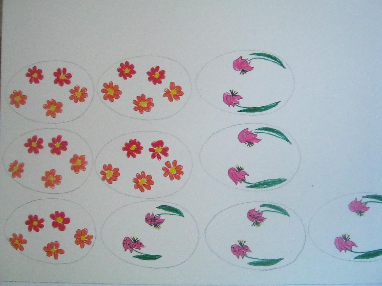 2. Se fac 2 seturi a cate 5 oua cu elemente asemanatoare. Eu le-am facut cu motive florale. Eu am gandit jocul pentru o plansa cu dimensiunile de 24x 24 cm. In functie de aceasta, am facut si ouale, astfel incat sa se incadreze bine in patrate.